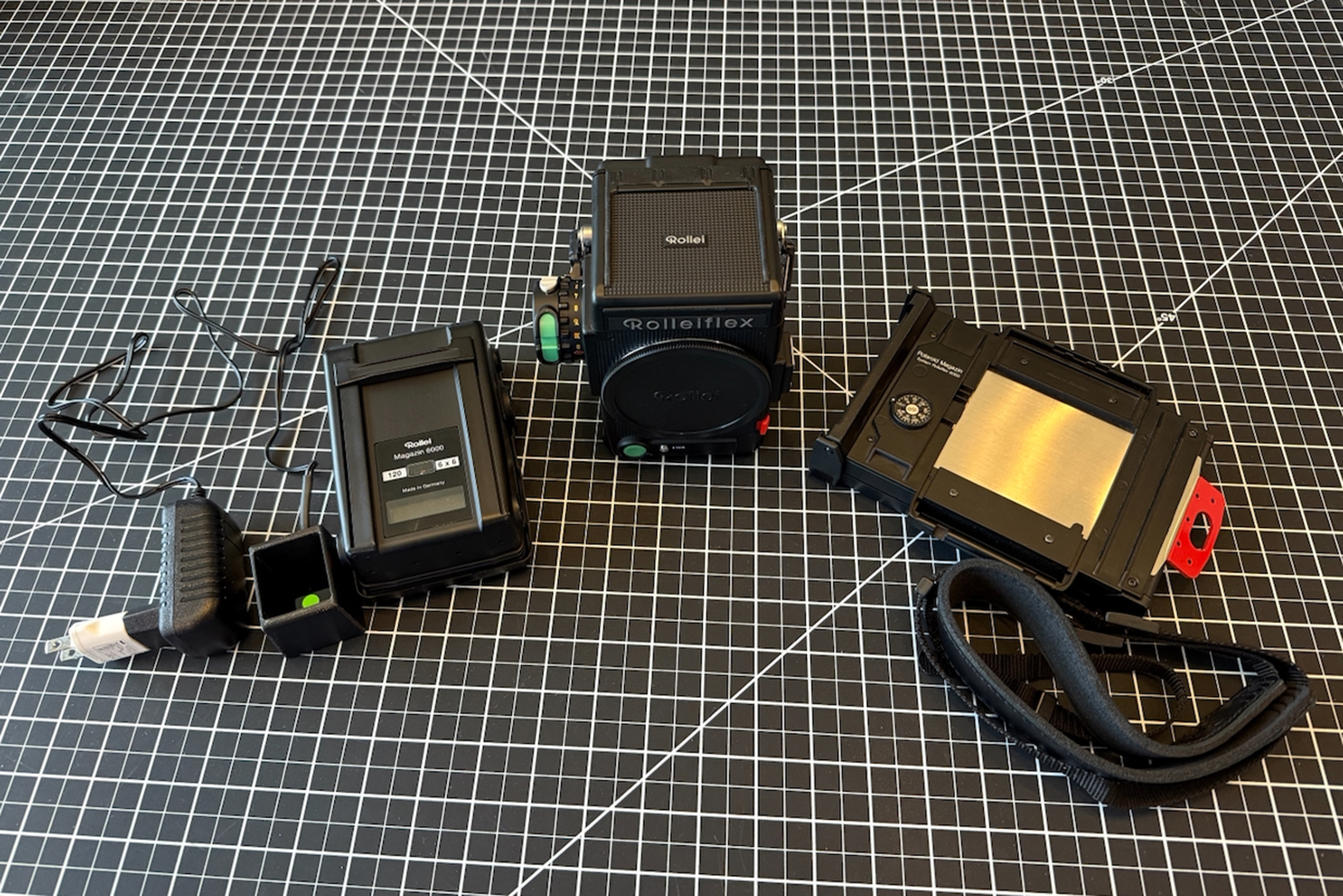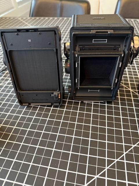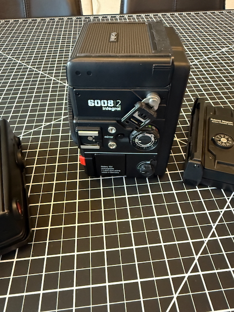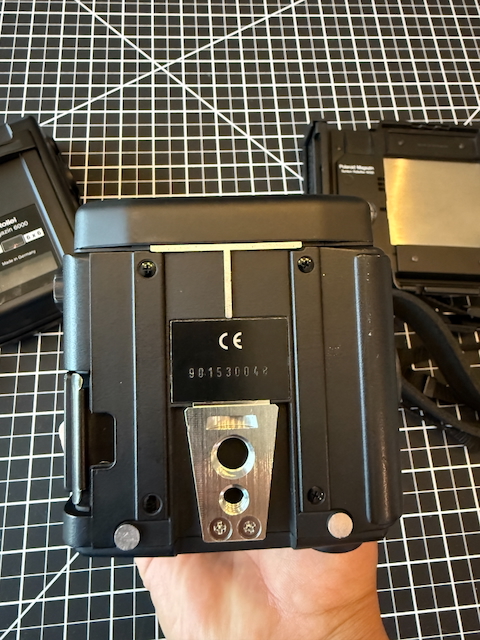 Includes: 6000 series 6x6 film back, re-celled battery and charger, Polaroid film back and a neck strap.