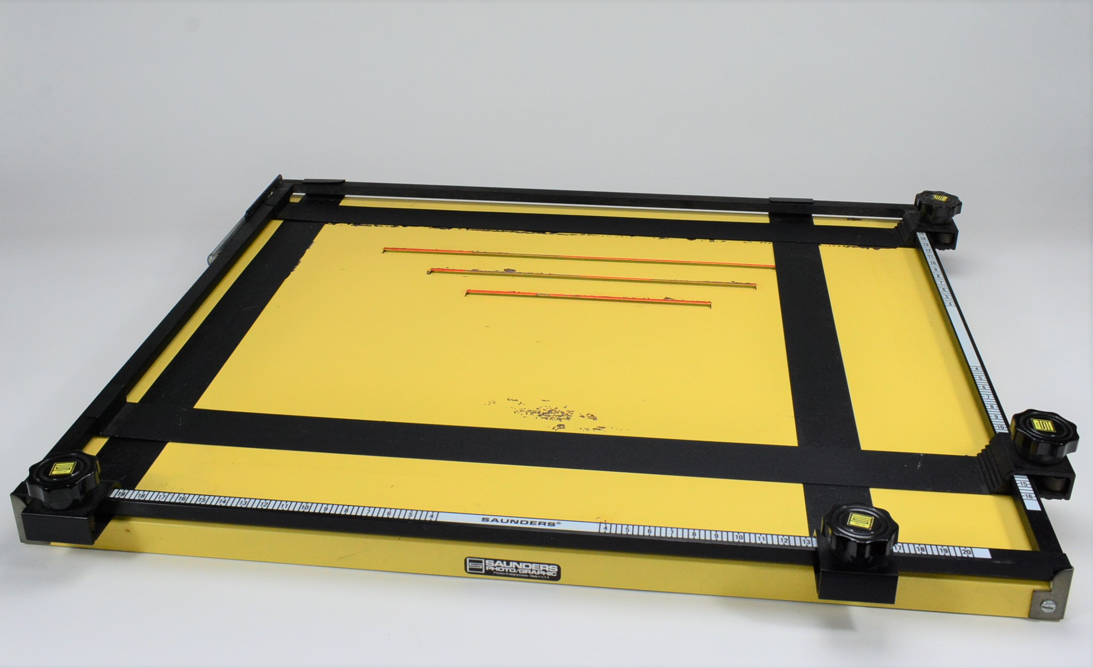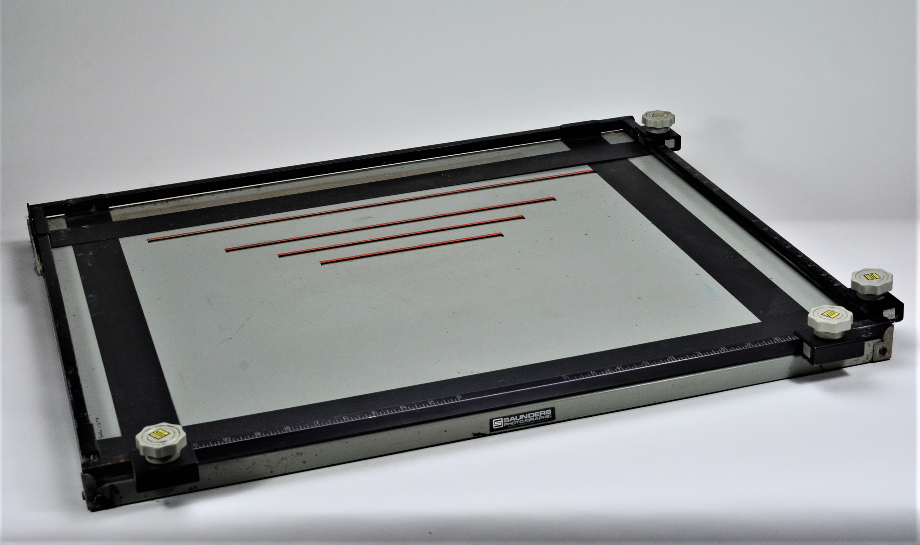 2- 11x14 Saunders U1417 4 blade easels . These can also be used as a 14x17 single size easel by popping out the 4 blade assembly. One is an older vintage, but both are in the same good condition and work as they were intended and both lock open to insert paper. I loved these easels, they were easy to adjust and kept the adjustments and were heavy enough not to move when placing in a piece of paper. I also liked that they were low profile and allowed a larger image if your darkroom is height challenged, and they both have the nonslip rubber bottoms.