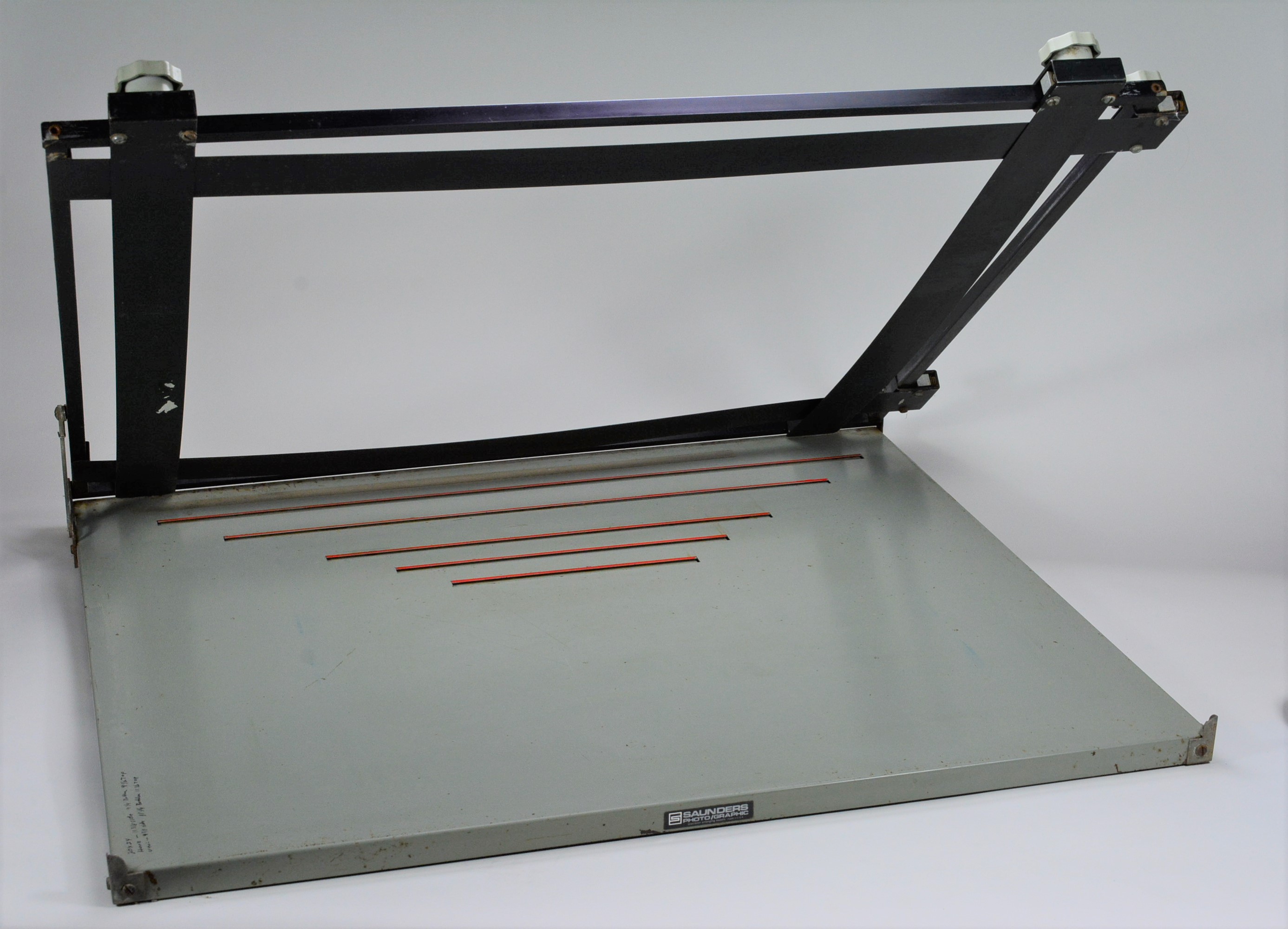1-16x20 Saunders 4 blade easel in good condition. The easel has some paint missing, but that is only cosmetic and the easel otherwise works smoothly. The easel locks open as intended for placing paper.