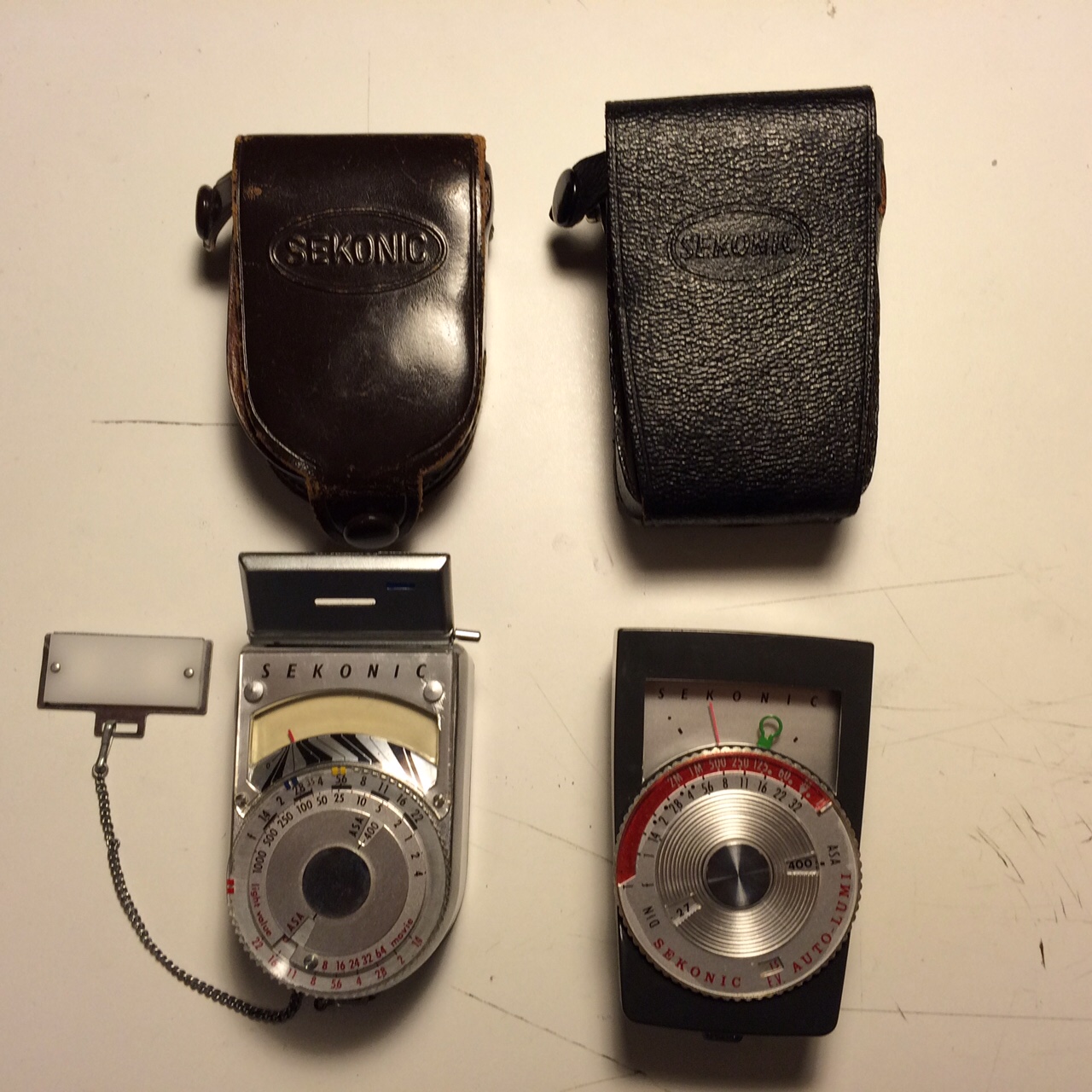 ). $30 shipped ConUS.2. Sekonic L-8 - another nice one, shows wear where one would expect from general use. Includes the incident mask and case as pictured; the case is coming unstitched at the back, but is otherwise good. Dial is a little stiff, and the high/low cover button is a little bent, but otherwise working well. I did open it up to clean the inside of the glass, but that's it. $20 shipped ConUS