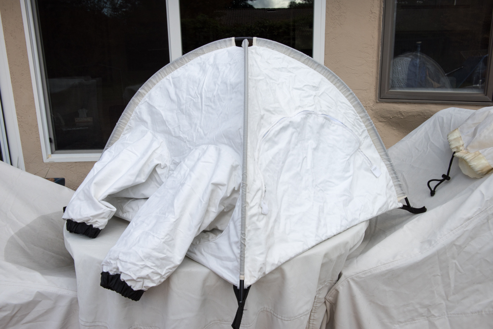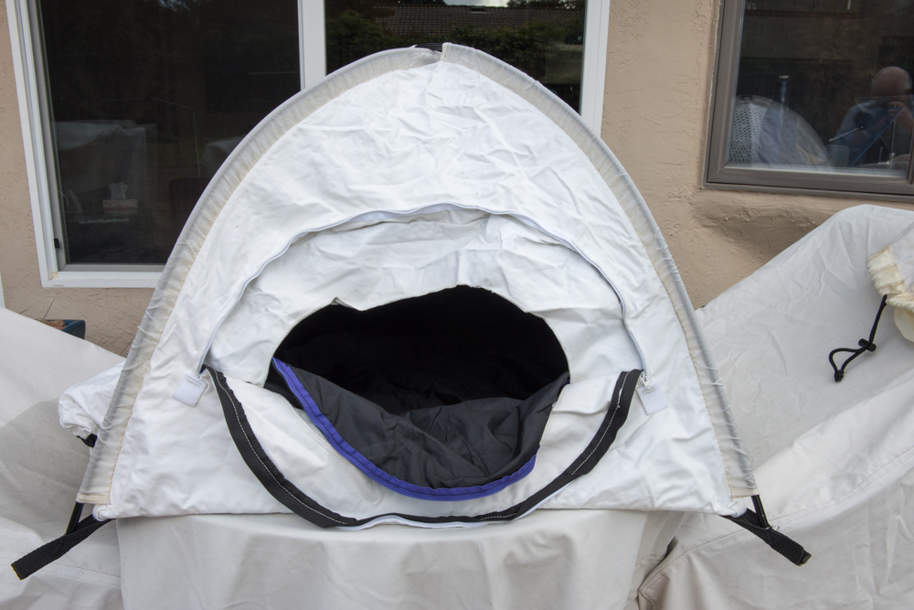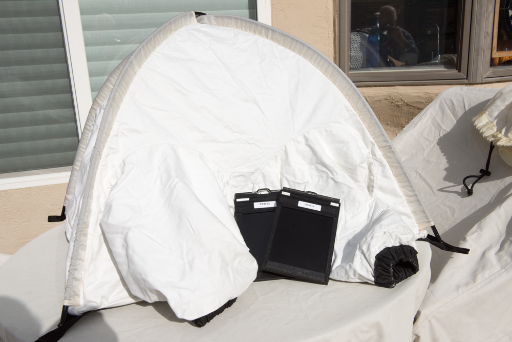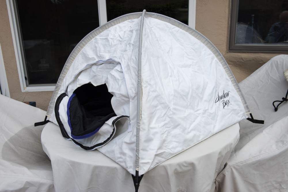 The Shadow Box was invented by a working photographer, Brian Chisholm of Chicago, the Shadow Box solves most of the problems of the traditional changing bag. For one, it`s built like a tent, which means no more floppy cloth getting in the way of what you`re doing. It`s also roomy and has built-in storage pockets, so it`s convenient and efficient. It came in two sizes and this is the large one (base 27"x27") which would make changing 8x10 film easier.