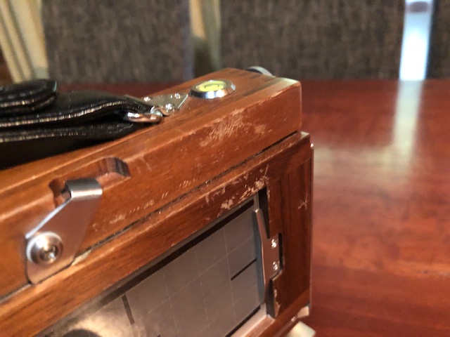 I’ve tried to capture the condition of the camera, which has some lacquer wear. This photographs worse than it is, but so be it. The bellows are fine; however, the front of them is a semi-bellow design to allow ultra-wide angle lens’ movements doesn’t fold well. This has no affect on the camera’s use.