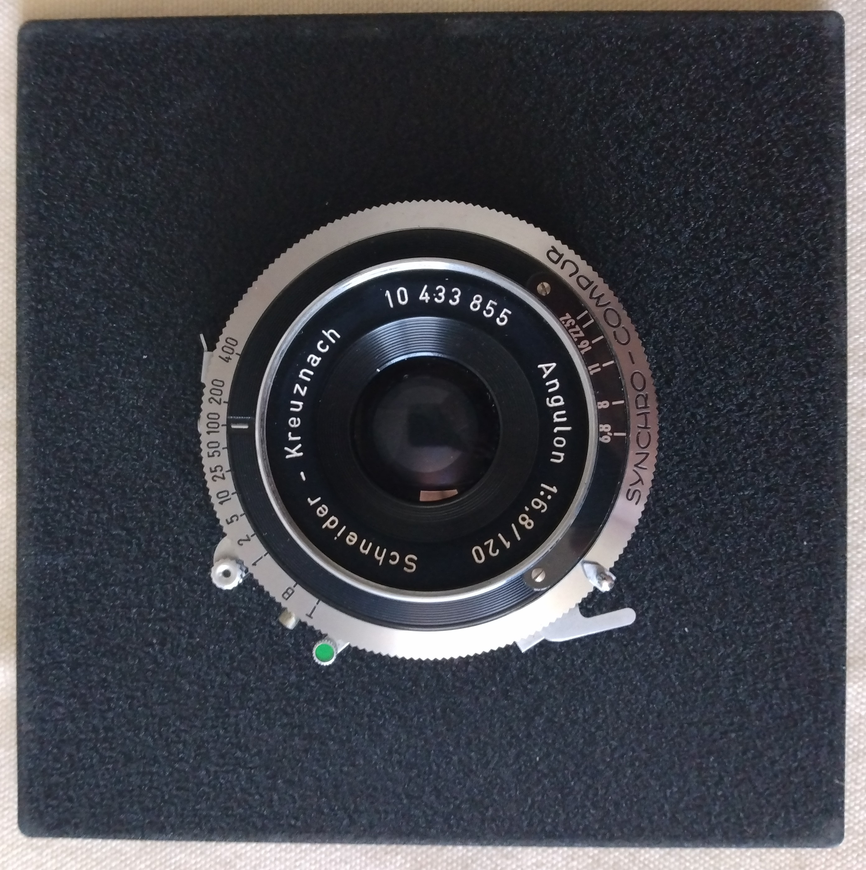 • Schneider-Kreutznach Angulon f6.8/120mm - Synchro Compur shutter, f6.8-32, B-400; no haze, no fungus. All shutter speeds unreliable