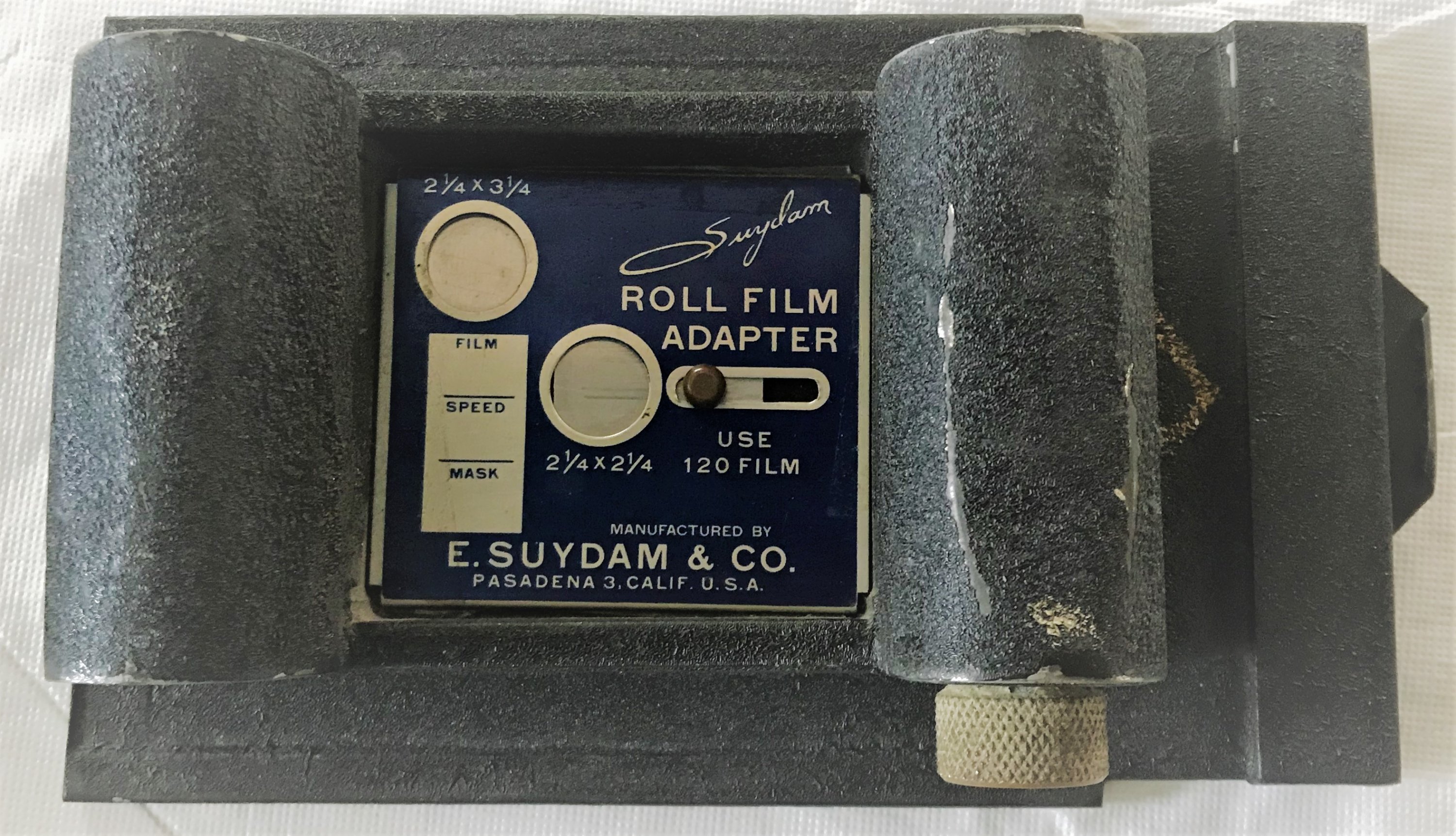 This is a 120 roll film adapter that I last used on a 3.25 X 4.25 Super D Graflex. Can produce 2 X 3 and 2.25 square images (2 X 3 without the mask) Included is the adapter, film holder insert, 2.25 square mask, instruction sheet, and the original box. The adapter has some scuffing and a small dent that does not affect it. Also included is one slotted 3.25 X 4.25 film holder for the Graflex which has some outdated sheet film still in it.