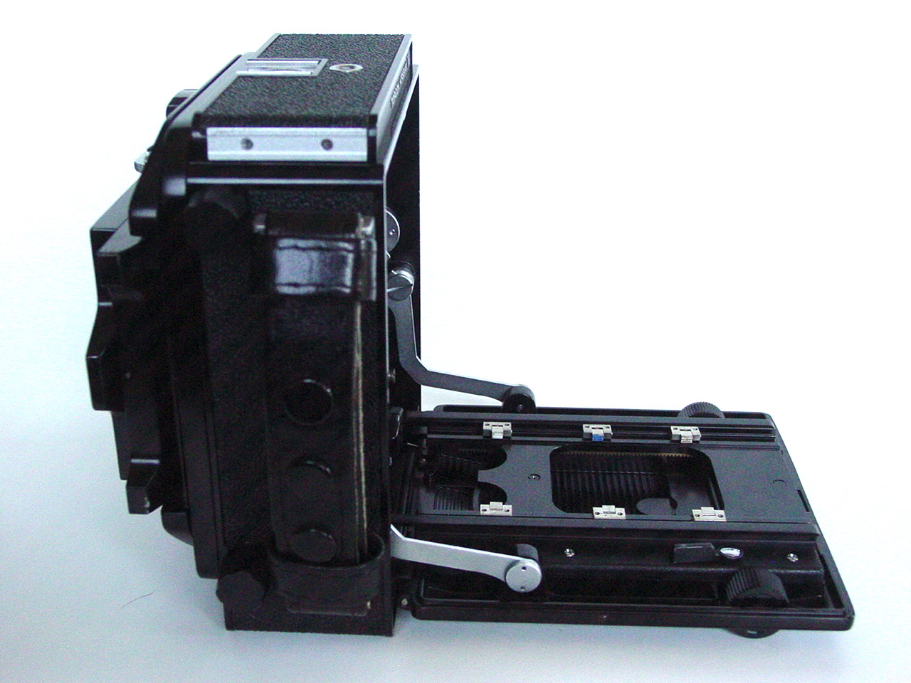 This camera has a technical back that extends an extra 23mm and provides back tilt and swing. Front movements - Tilt, shift, swing and rise.