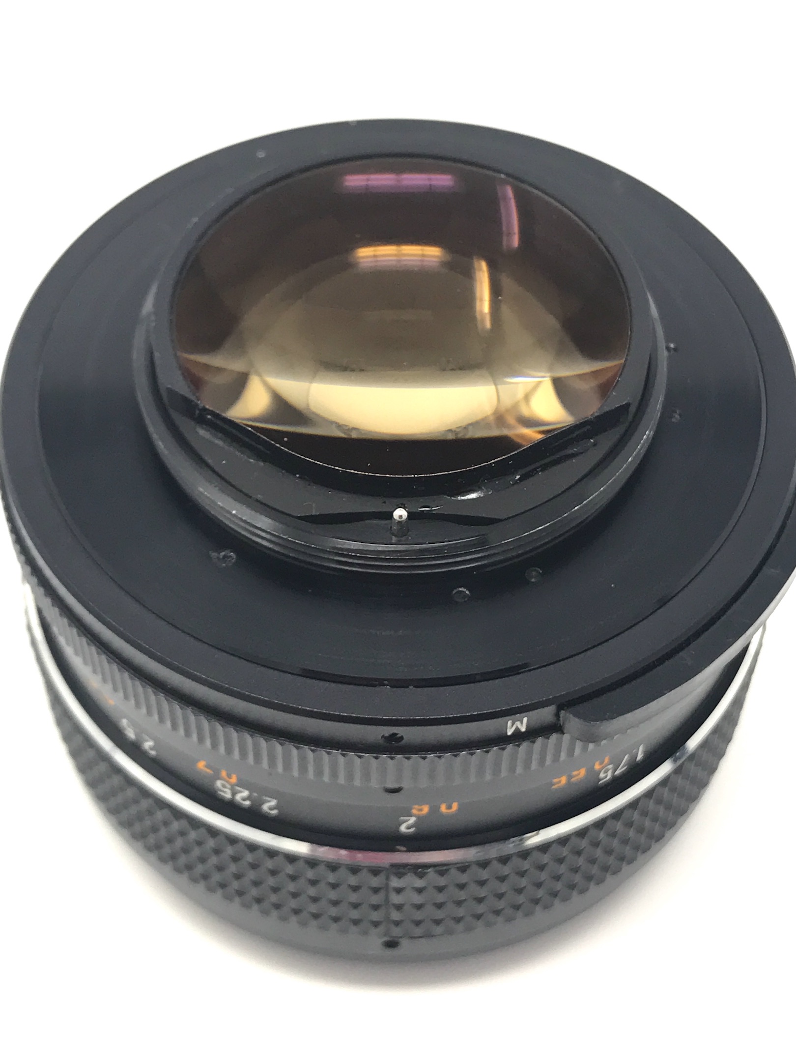 Lens is in excellent shape. No scratches on glass, just a little dust inside. Very small scuff on barrel next to 3' mark. No other issues aside from that and looks barely used. Including case (most likely not original) and Tiffen UV filter. Here's a nice mini article + review on the lens: http://fuckyeahlenses-blog.tumblr.com/post/1706808448/tomiokakogaku55mmf12