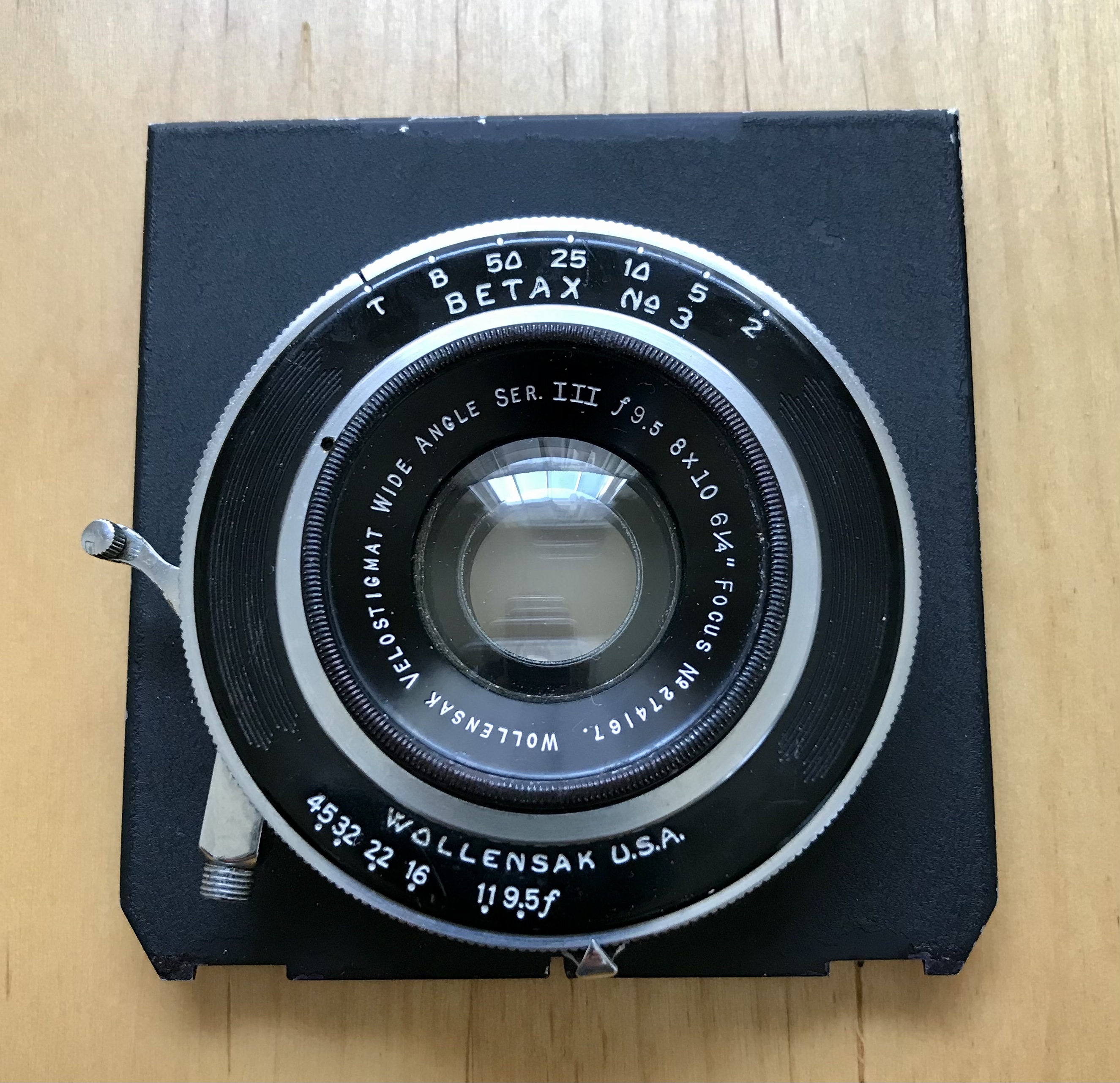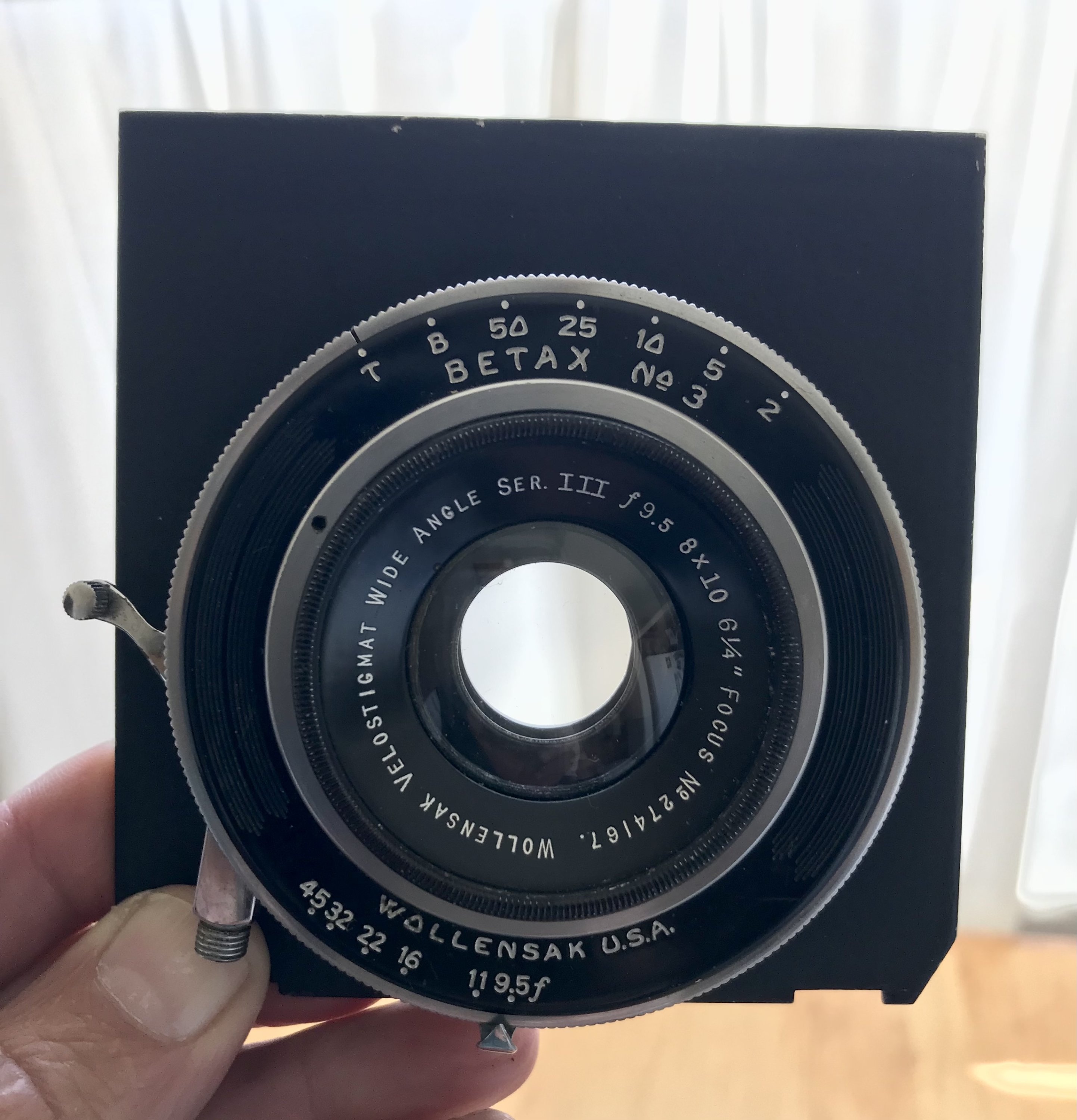 I have for sale Wollensak Velostigmat Wide Angle Series III f9.5 6 1/4” (159mm) lens. A little wide angle lens that covers 8X10. The glass is fairly good with no major blemishes my eyes can see. There might be a speck of some dust here and there but it’s pretty clean for it’s age really. Comes with home made lens caps that won’t win any awards but protect the glass as intended. The Betax No. 3 shutter works good on all settings but I can’t verify accuracy but sound “about right to my ears”. Comes mounted on a Technika style lens board. A perfect lens for backpacking compared to the behemoths that are found in this focal length from other lens manufacturers options. If you have any questions please ask. $385.00 with shipping included in US.
