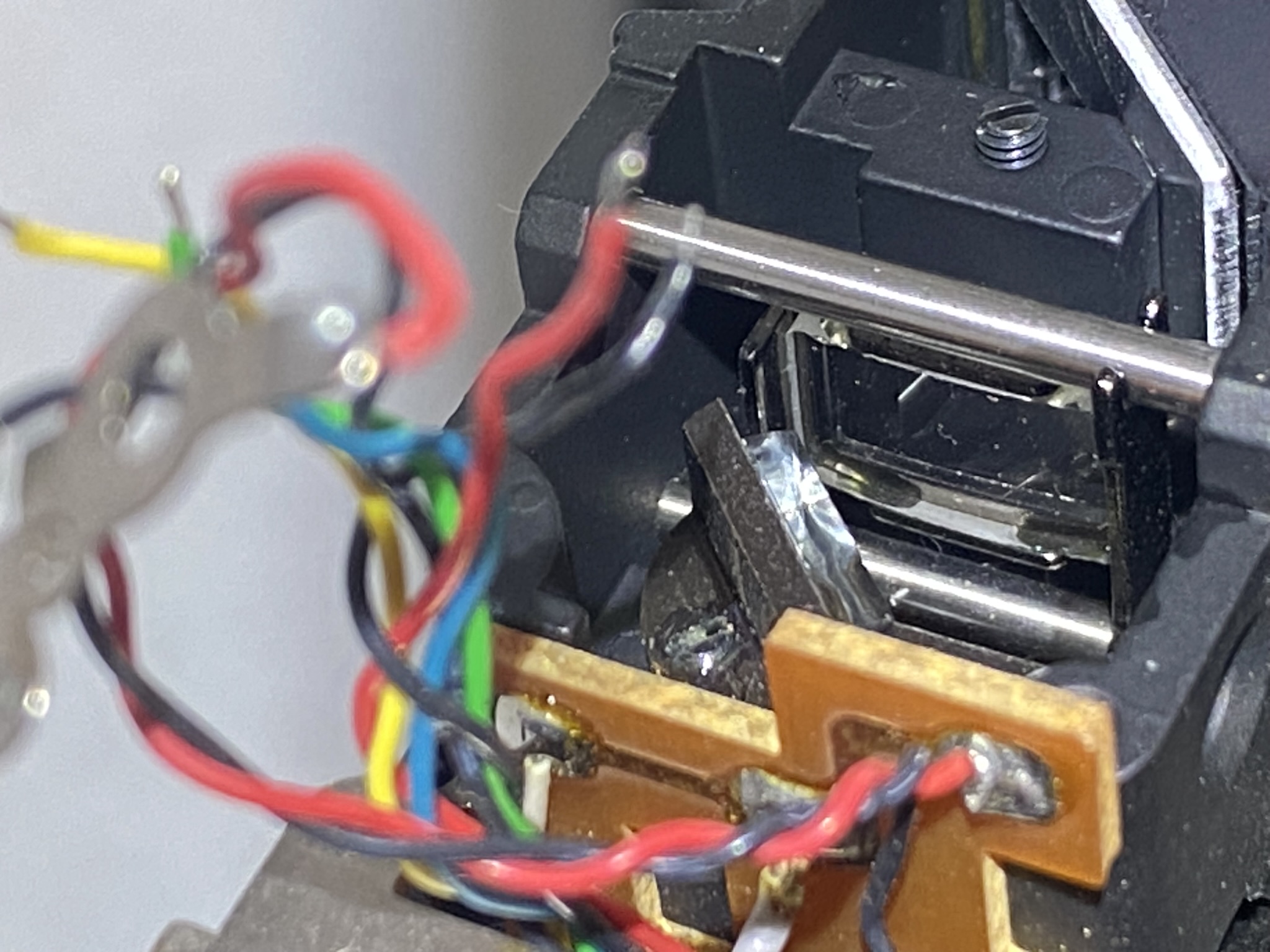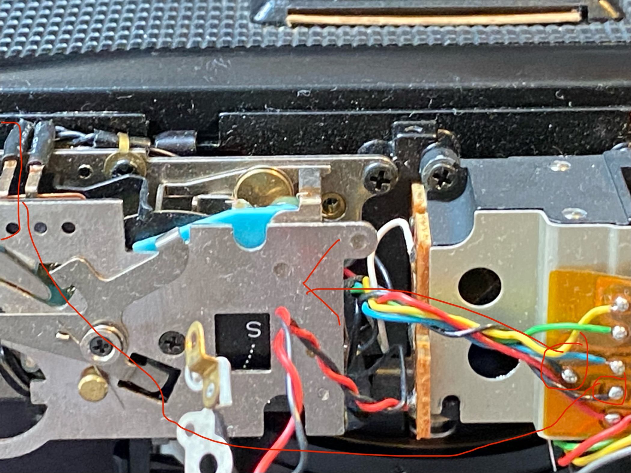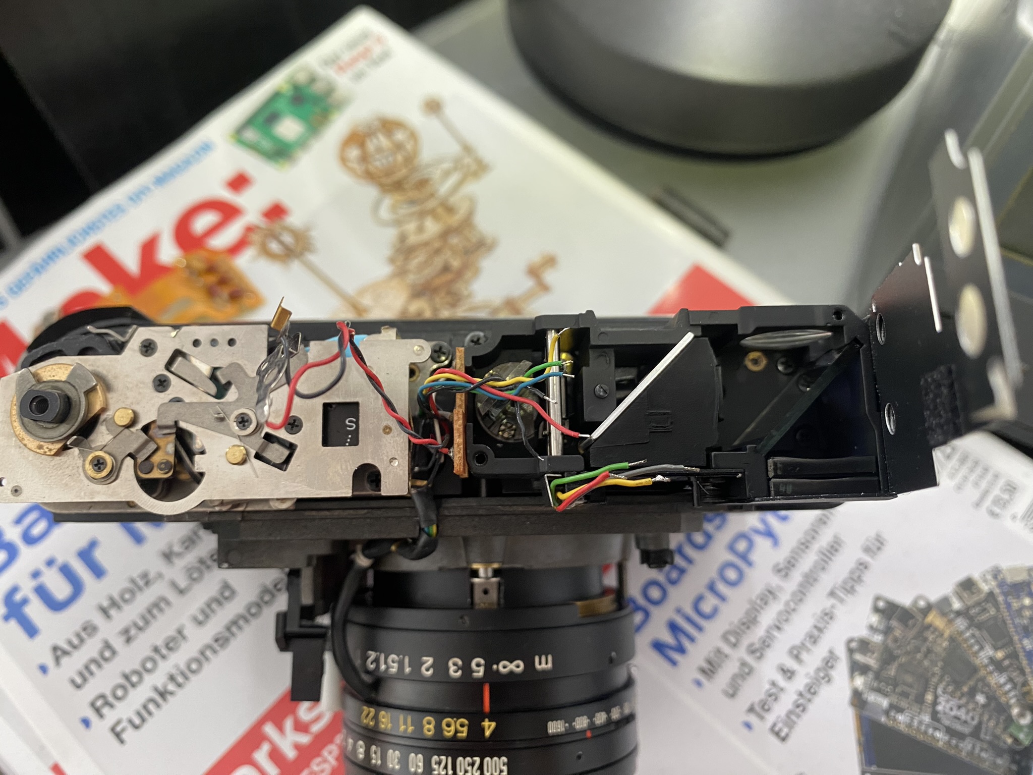 @BobUK To your viewfinder question: If you have already checked everything with the rod coming from the lens to the body, then you need to look into the rangefinder. For this you need to desolder the electronics and remove the top hood. When desoldering the electronics, note that there are two black wires. IMG_0370.JPEG shows which black wire is connected to GND and which to something related to the flash.