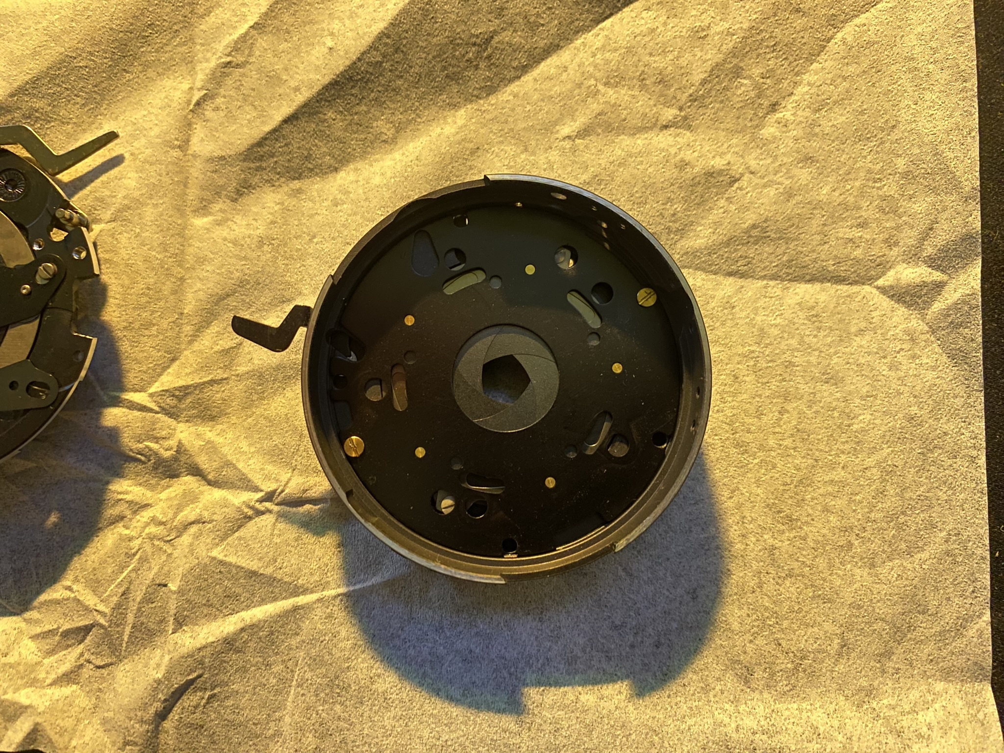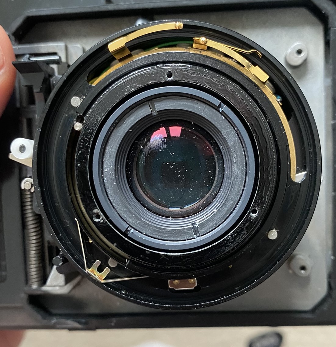 But: Yes, I'd agree. Gently remove the cone with a plastic clip. Then you are at IMG_0457.JPEG and need to disassemble the whole thing until the front lens can be unscrewed. For this you need a lens spanner wrench. Handling a lens spanner wrench can be very fiddly, especially when the lens screw sits very tight. Then the risk of slipping of and breaking something is great. This is the most difficult part here. Unscrew it from the outer screw. You do not want to unscrew by the inner screw and disassemble the lens group. Attatched to this message are all pictures I made when disassembling it (ordered in Disassambling steps up unto the shutter). Maybe this is helpful.
