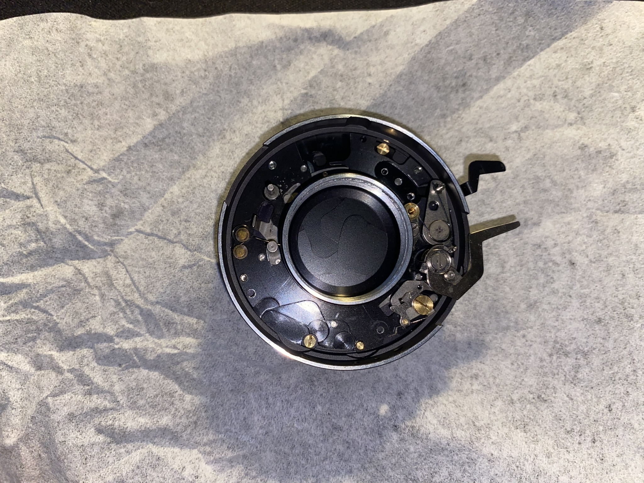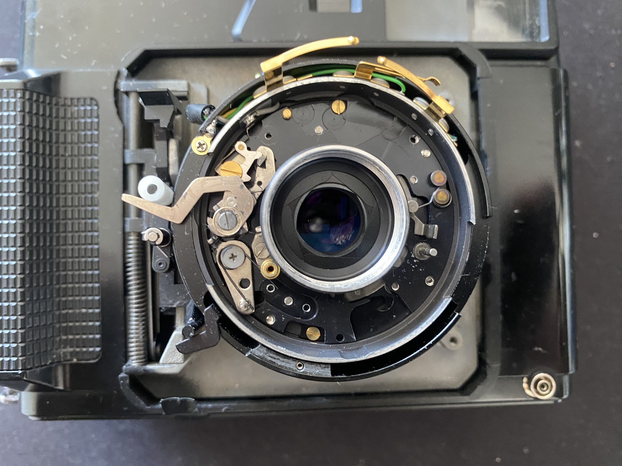 One small hint: When disassembling the front unit, you can lose a ball bearing (see IMG_0458.JPEG, underneath the v-shaped spring). Do not lose that, otherwise the aperture loses its clicking.