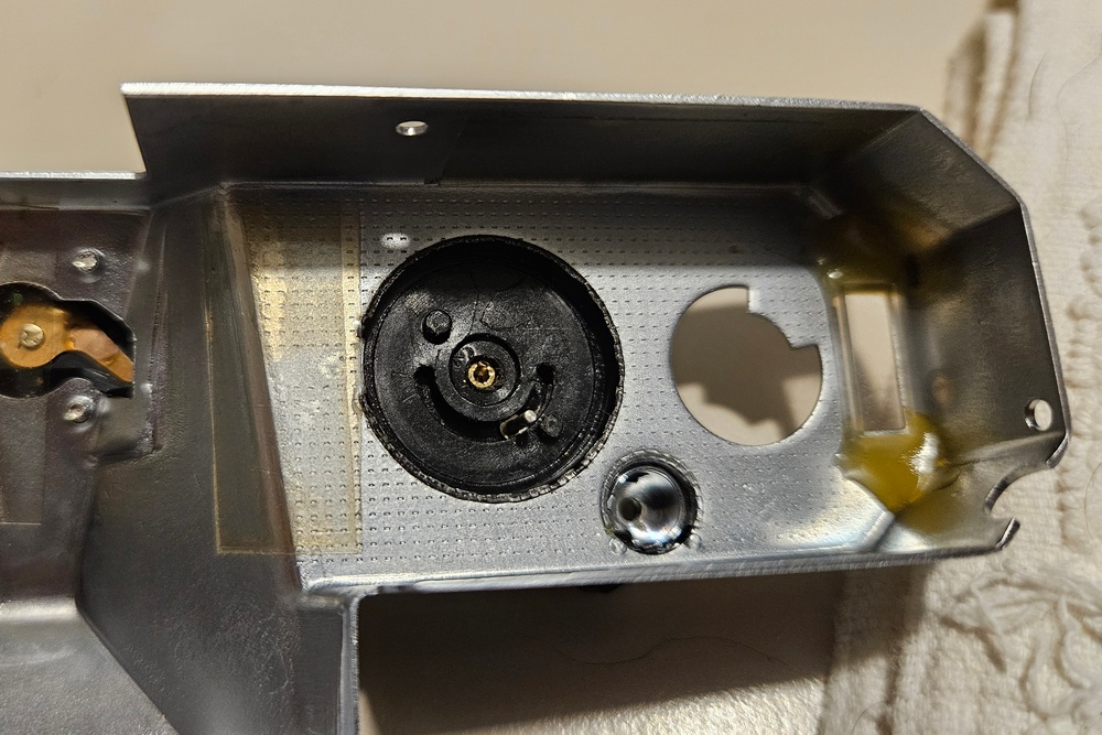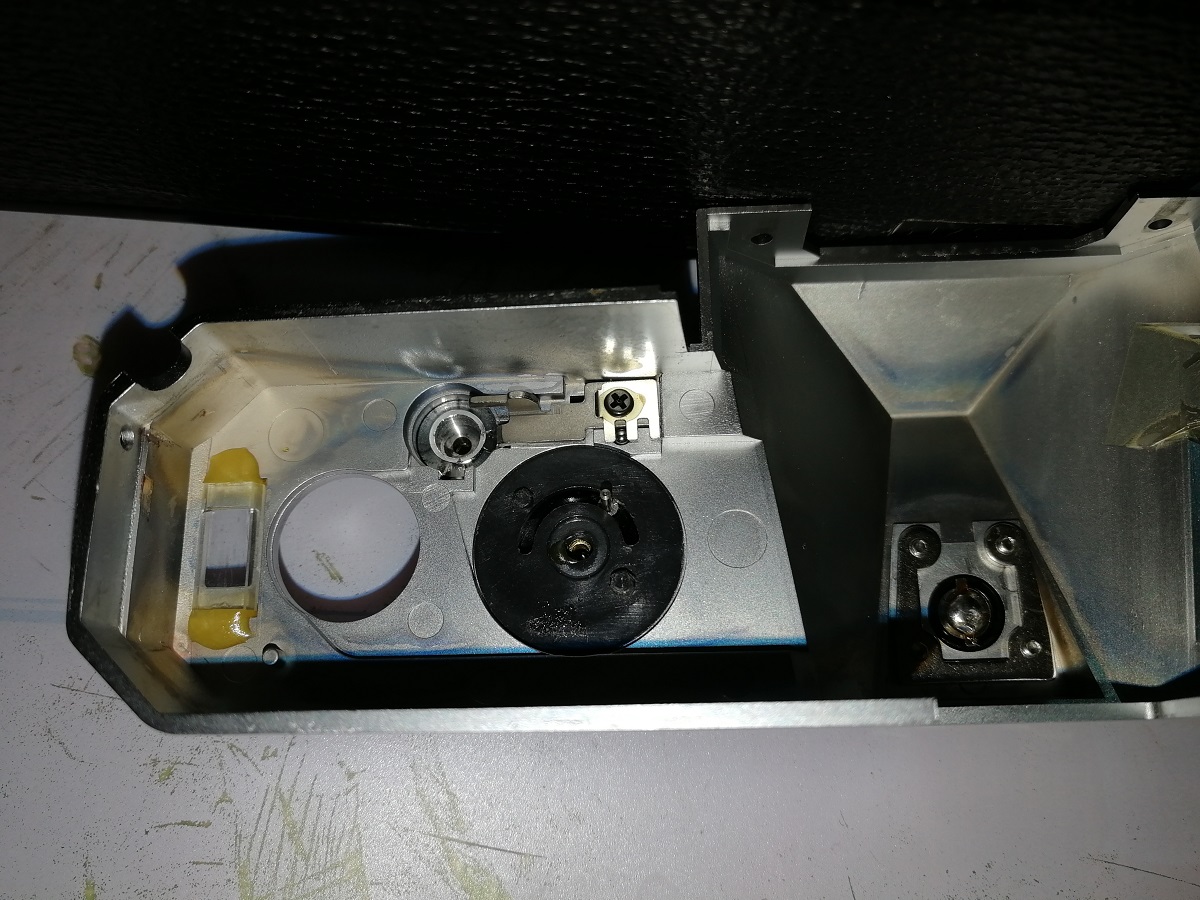 However, there's a problem: when I remove the top cover, I notice that the shutter speed/ASA dial is solidly attached to the cover and comes off with it. This isn't a problem, except that the positions of the bulb exposure and the minimum shutter speed (1/700) don't match their stops; furthermore, the two discs indicating the shutter speed and ASA are stuck together, so when you lift the outer ring, they rotate together (while only the ASA selector should rotate).