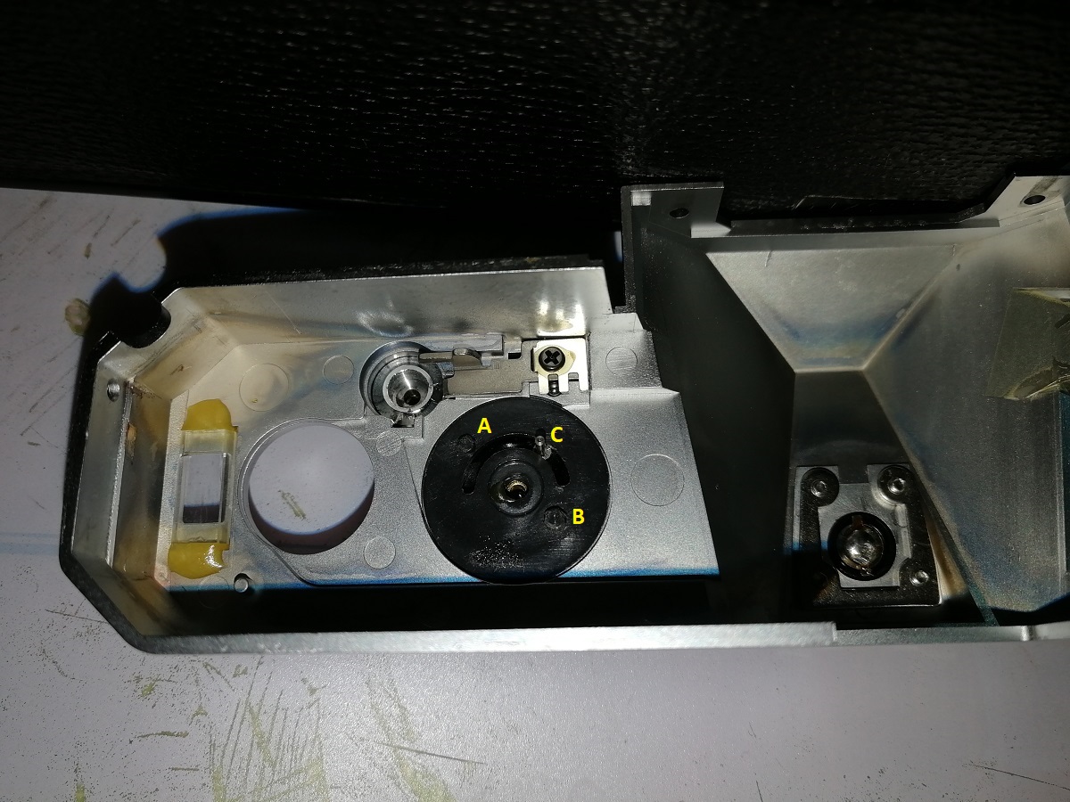 Ah... so C rides in the curved groove and is the ISO setting? So it gives a constant offset with a resistor or such based on the metal in the ring. A and B mate to rotate the whole dial assembly on the body.