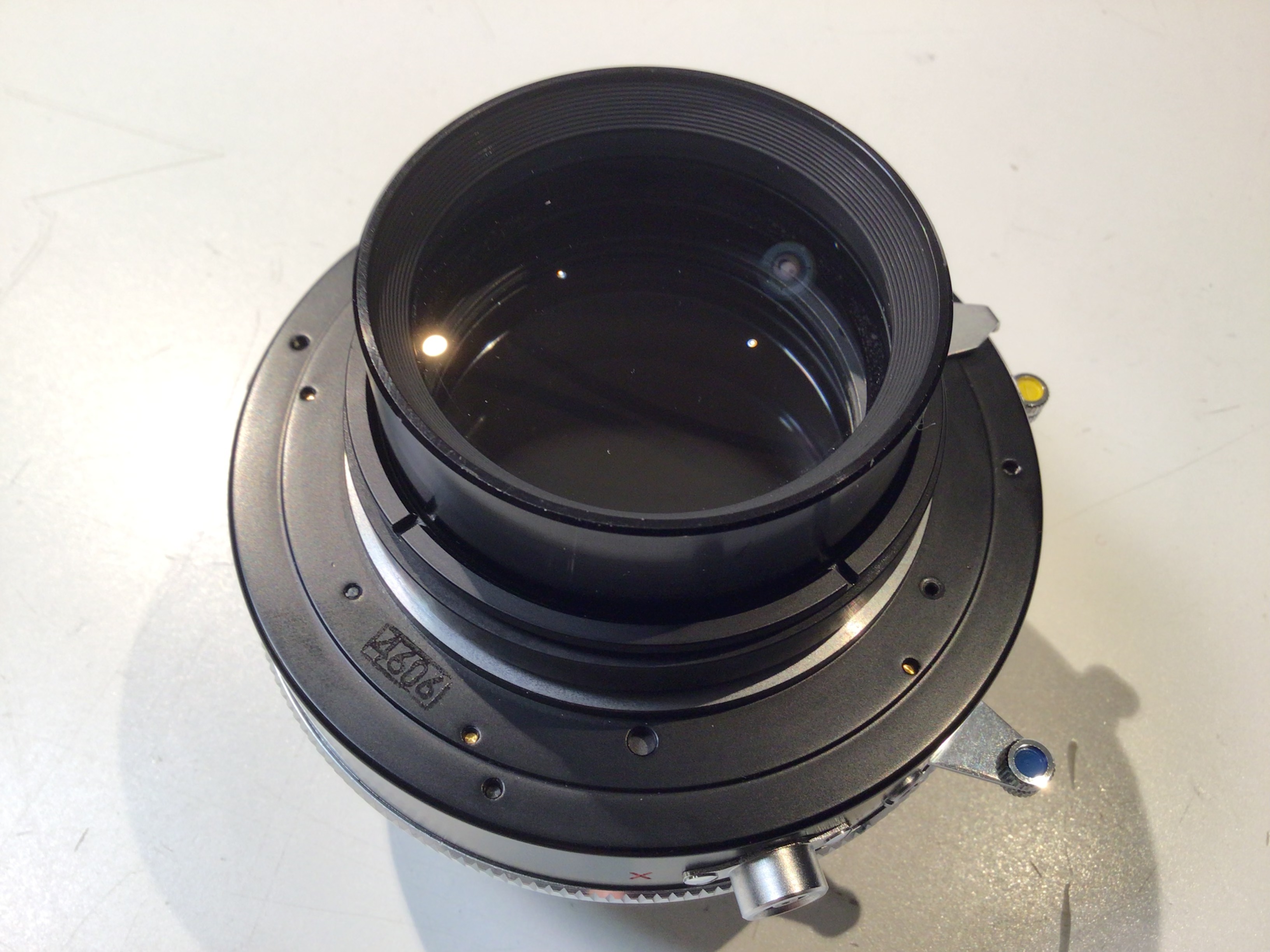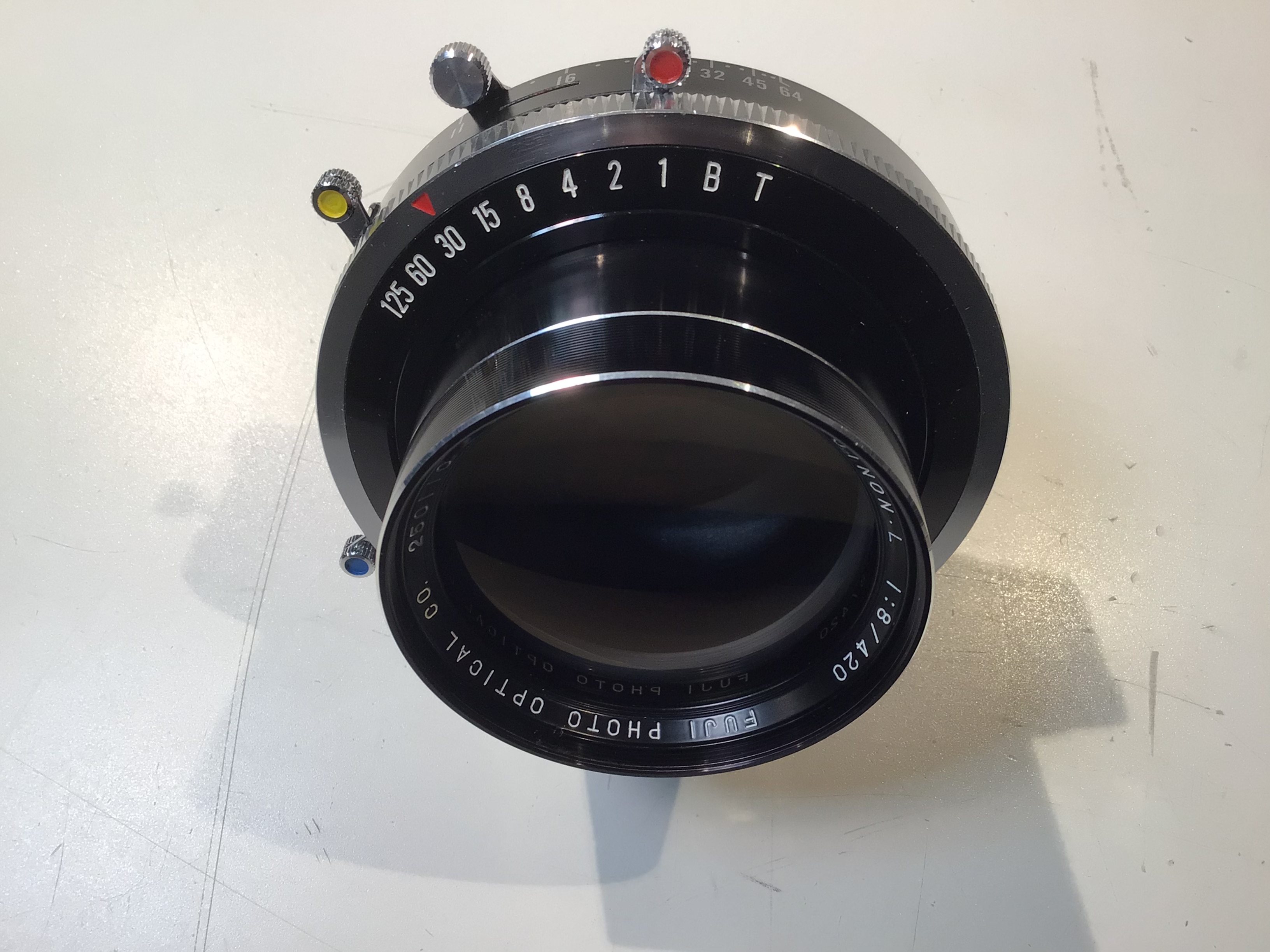 This is a nice condition Fujinon L 420 lens. It’s mounted in a Copal 3S shutter. The glass looks very clean with no observable marks and the shutter is firing properly at all speeds (speeds are not tested). The image circle is 480 mm, enough to titillate 11x14.