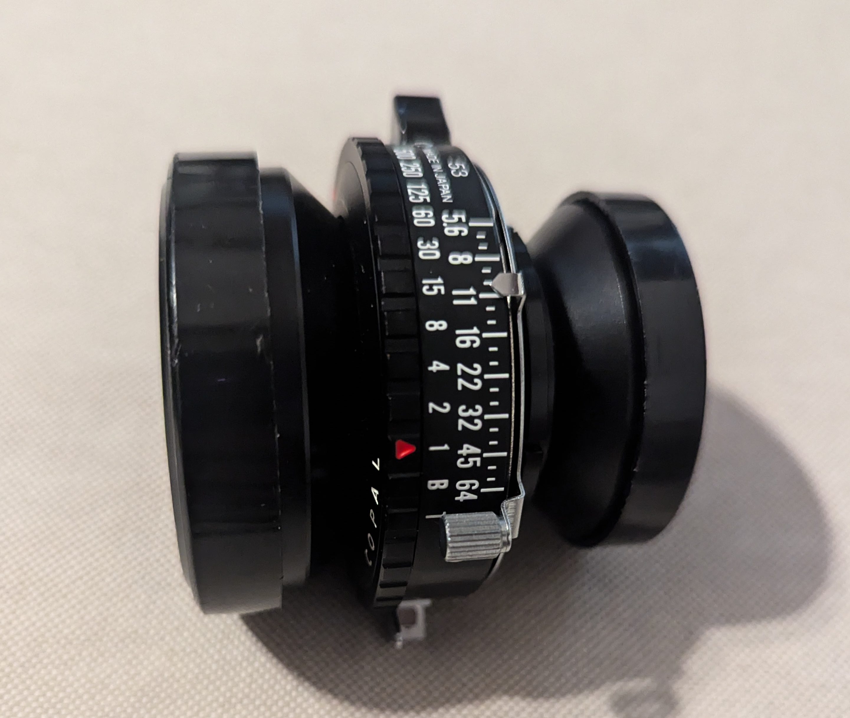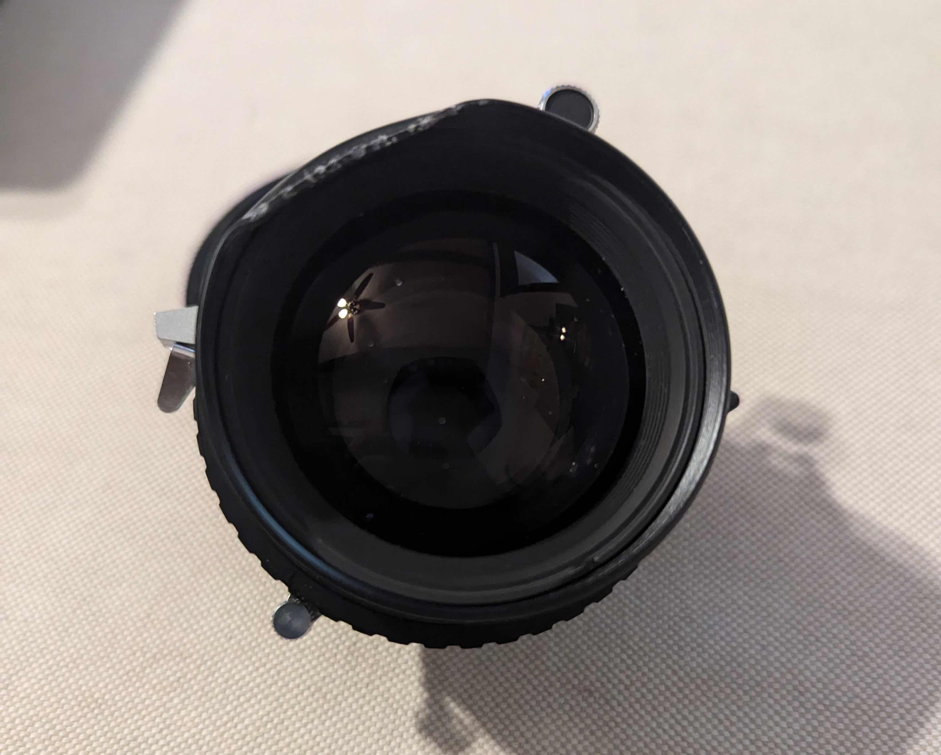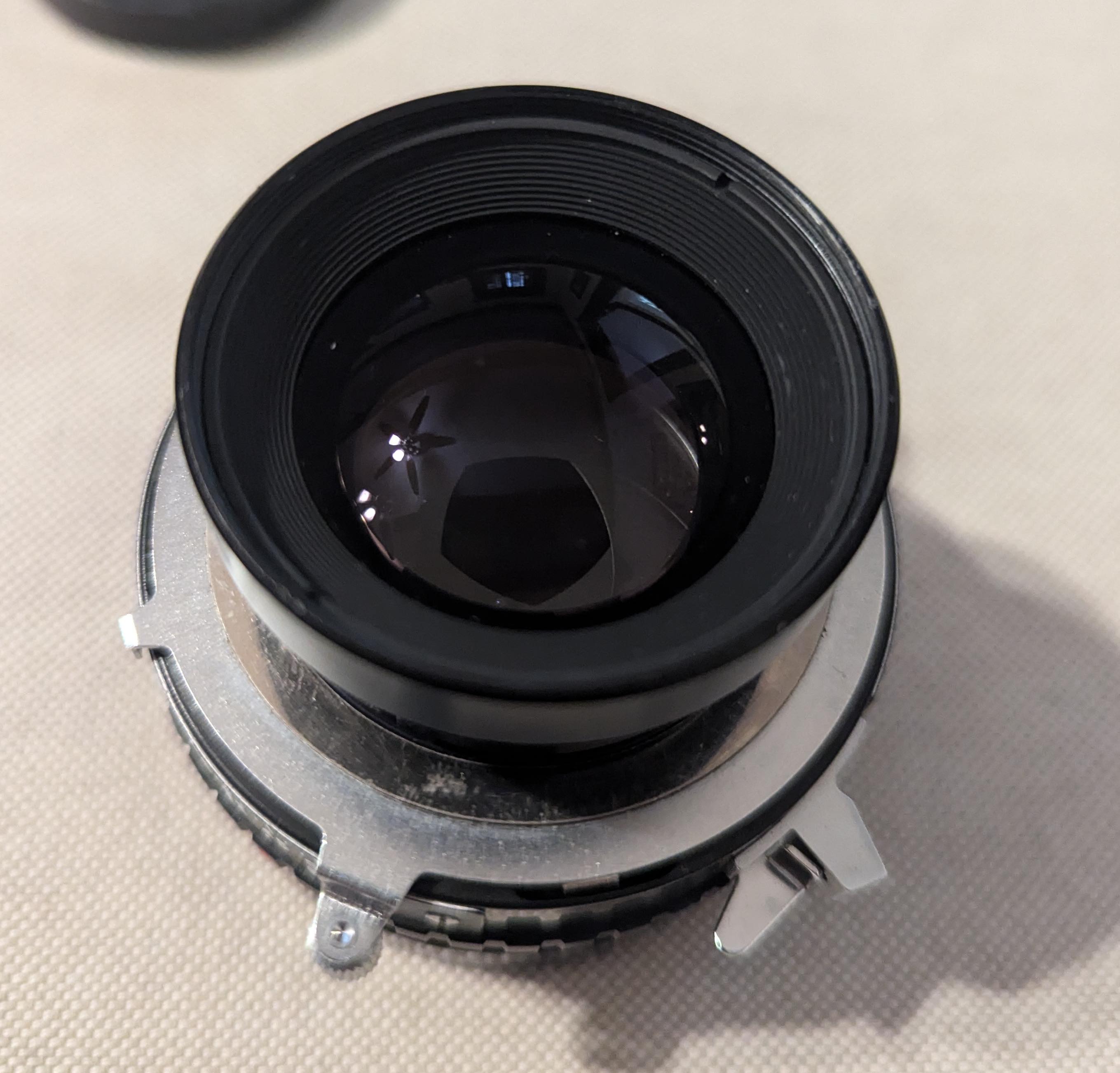 I'm selling a Fujinon W 150mm on a copal 0 shutter in perfect working oder, except for one thing, The lens took a drop some time ago and bent the hood/filter thread. Ive kept it thinking Id bend it back to place. Had another 150 in the mean time and never got around to it.