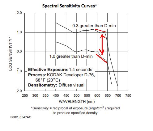 Well, it is what happens in fact with TMY if placing a red filter, it has a well lower sensitivity it the 600-650nm by 1.0D, and relative sensitivity should decrease more in that band by 2.0D, see again the spectral sensitivity graph.