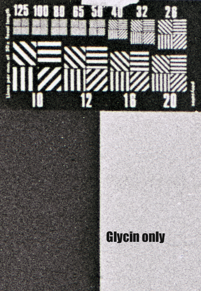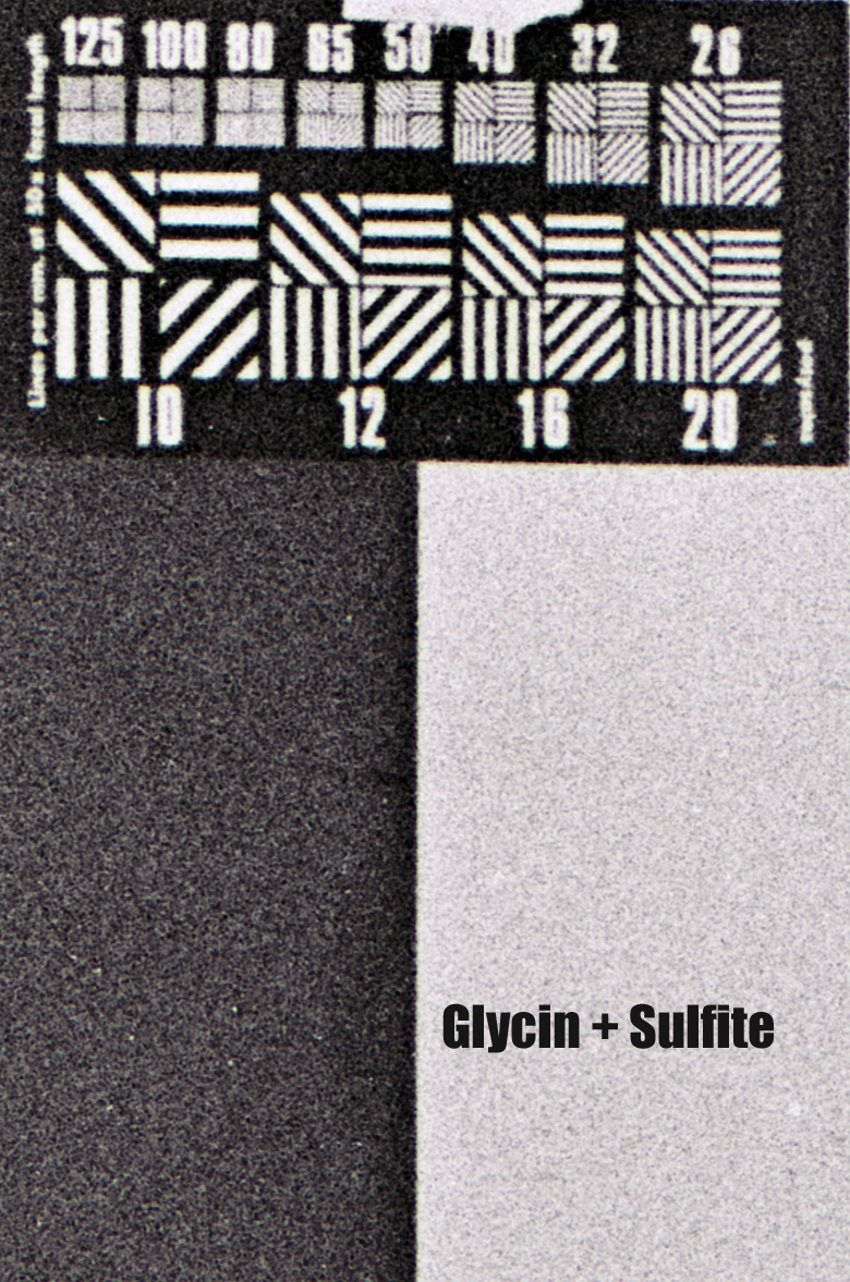 I tested an example formula with and without sulfite since read in the book by LFA Mason that, unlike metol, glycin will develop in absence of sulfite.