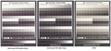 Sorry for resurrecting the thread but it happened that I made some VDB gold/thiourea toning tests these days and I think the results are interesting. I was interested in toning to completion and tested toning before and after fixing. The paper used was Arches Platinum. The results are, somehow, surprising. Even after approx. 40min. of toning I couldn't get neutral tones (one of my goals) when toning before fixing. Toning after fixing produced better results in this regard and the blacks were even darker than in Pt/Pd. These are some of the tests: