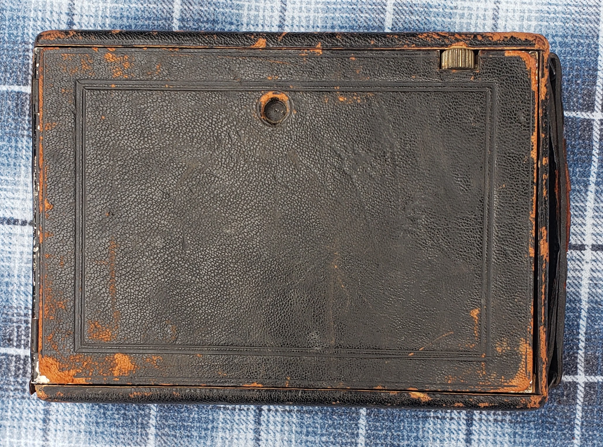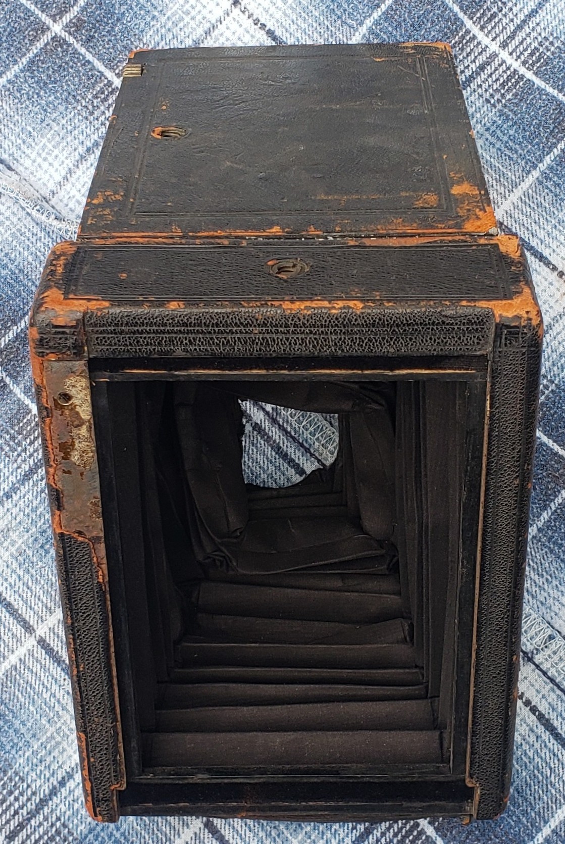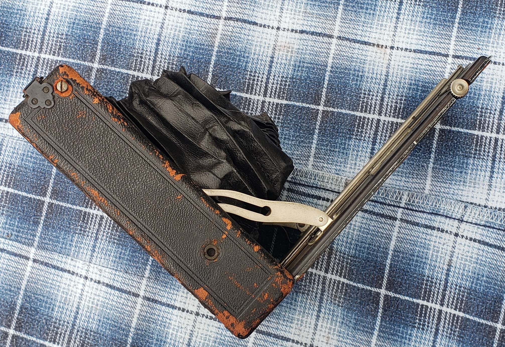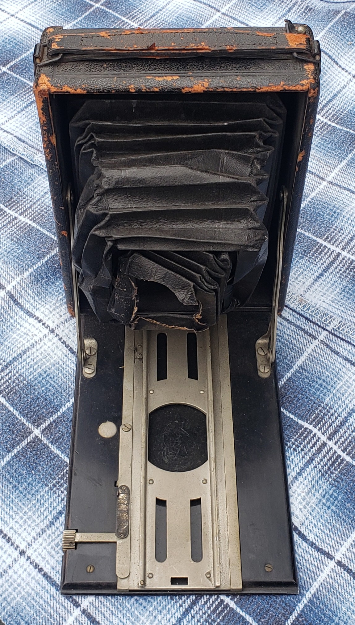 Interior measurement at film plane is 3 7/8" x 5 3/4"..originally used metal slide-in, plate-type holders..NOT included.