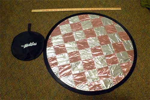 The reflector provides a soft fill-light without the hassle of a second light source. It easily folds to 12- inches circle and then expands to 32-inches. Metal interior frame. Zippered 12-inch case with carrying strap. In new condition. The reflector has silver and warm-toned squares so it adds pleasing warming to the shadows.