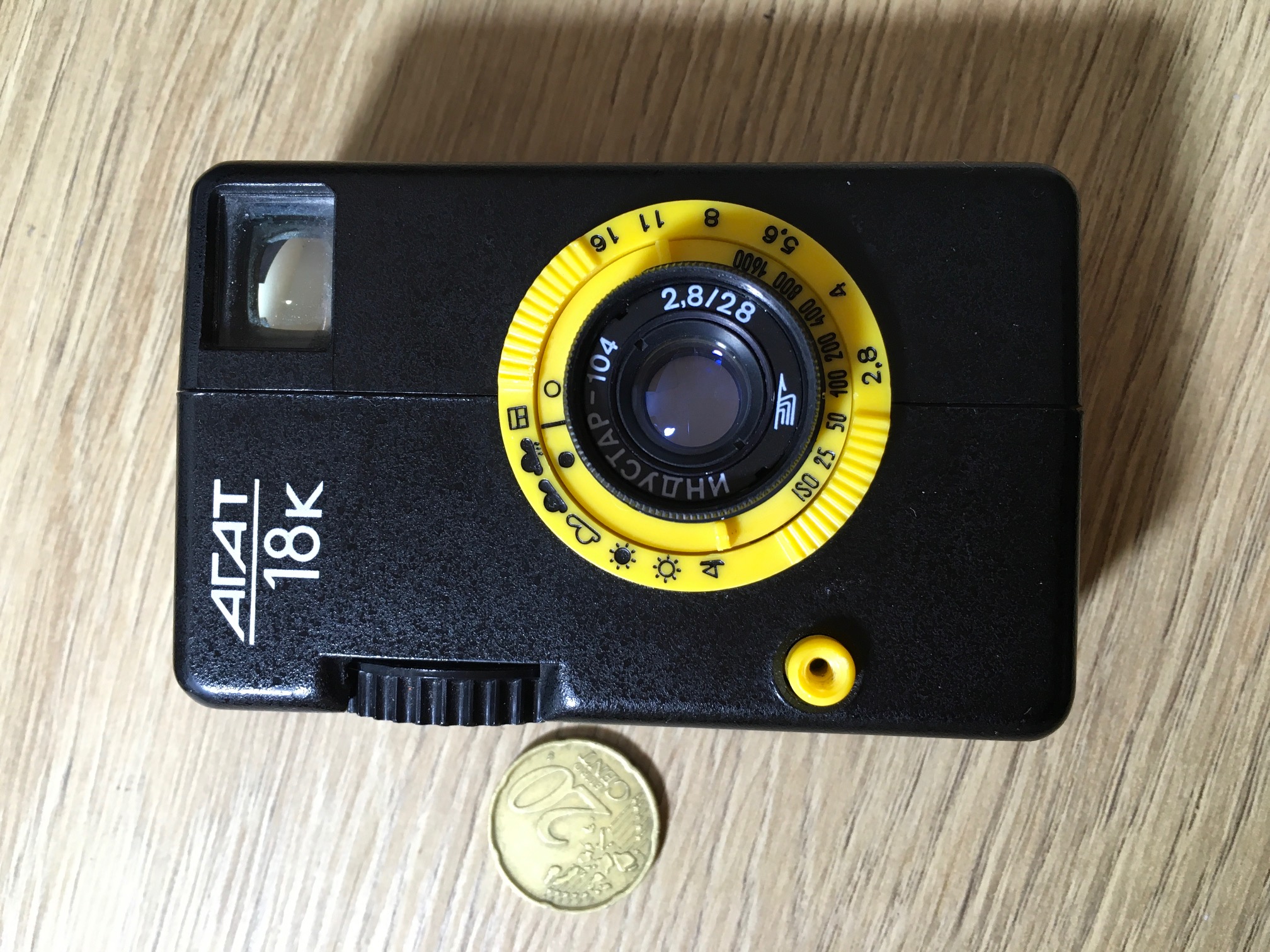 As for the Agat, I got mine for 1000 dinars here in Serbia, which is around ten bucks, and it was in pristine condition (the seller claimed it was unused, and it sure looked it). I've been using the hell out of it since then — my other stick-it-in-your-pocket-and-take-it-with-you-anywhere-you-go camera is a Minox 35GT. There are two modifications of Agat: Agat 18 and Agat 18K. The only difference is that with the latter you can use an empty film canister instead of the default receiving spool, and it also has a wire release socket.