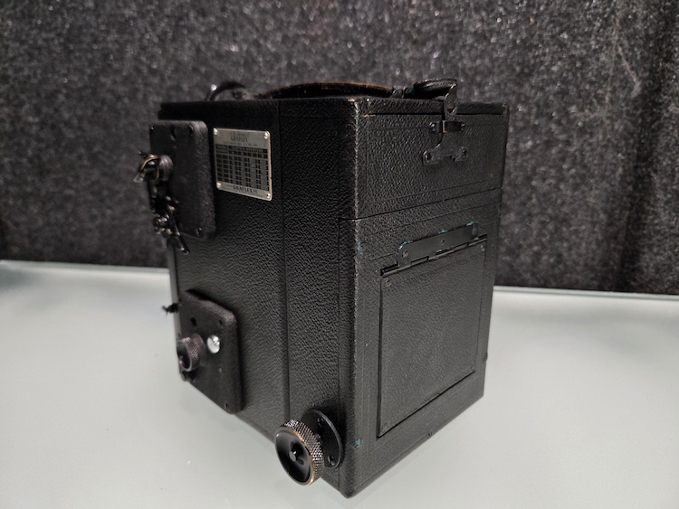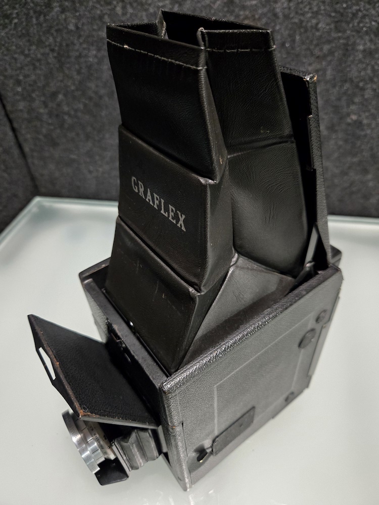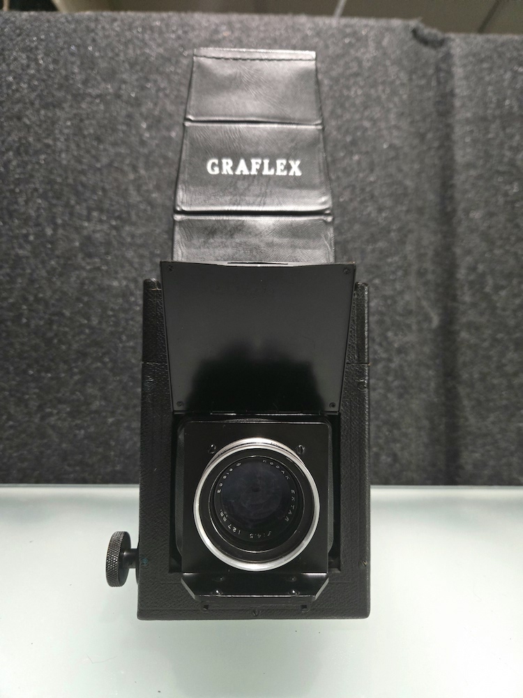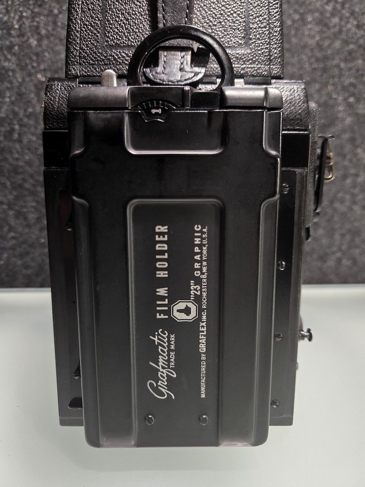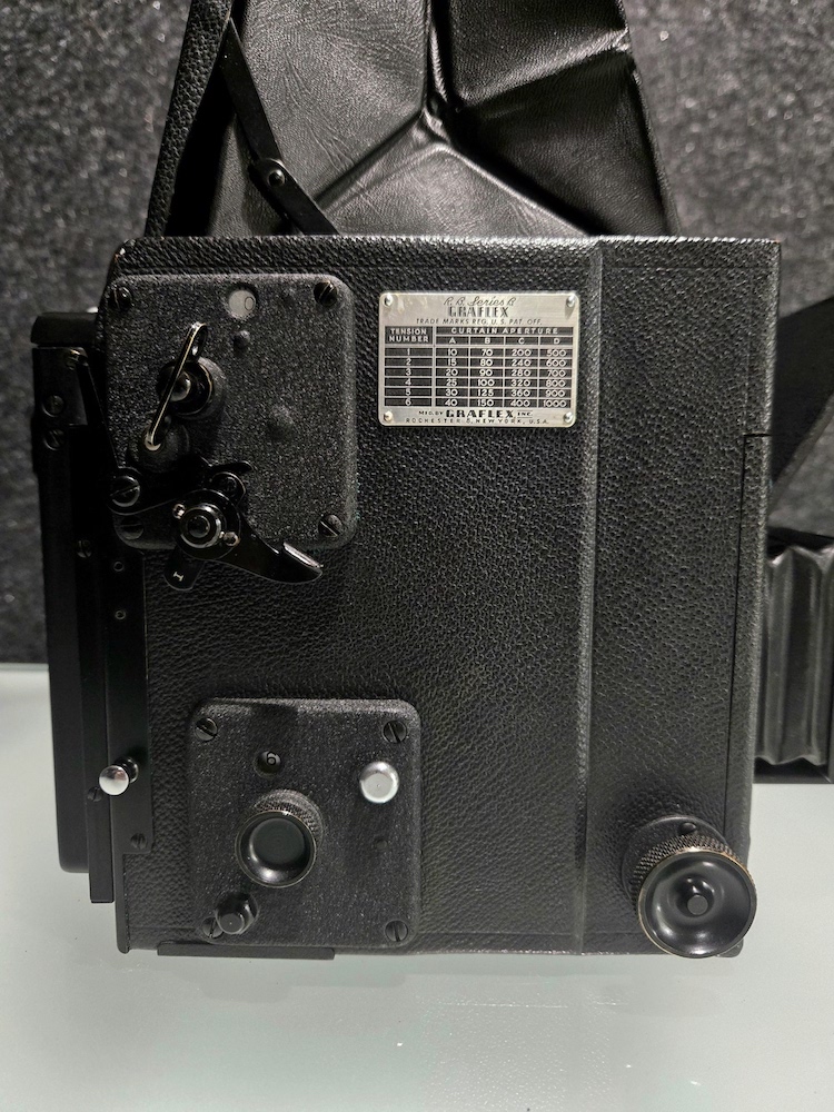 Graflex R.B. Series B Revolving Back 2¼x3¼ Camera serial number 372694. This camera was built as a part of an order of only 1000 on 12/5/1945. This camera is in very good condition. Please see photographers for details. All buttons, levers, knows, and latches appear to function as they are supposed to. I did not test the camera with film, but I did focus it on a ceiling light (pictured) and clicked the shutter. That is as far as the unit was tested. Because of its age, this is being sold "as is."