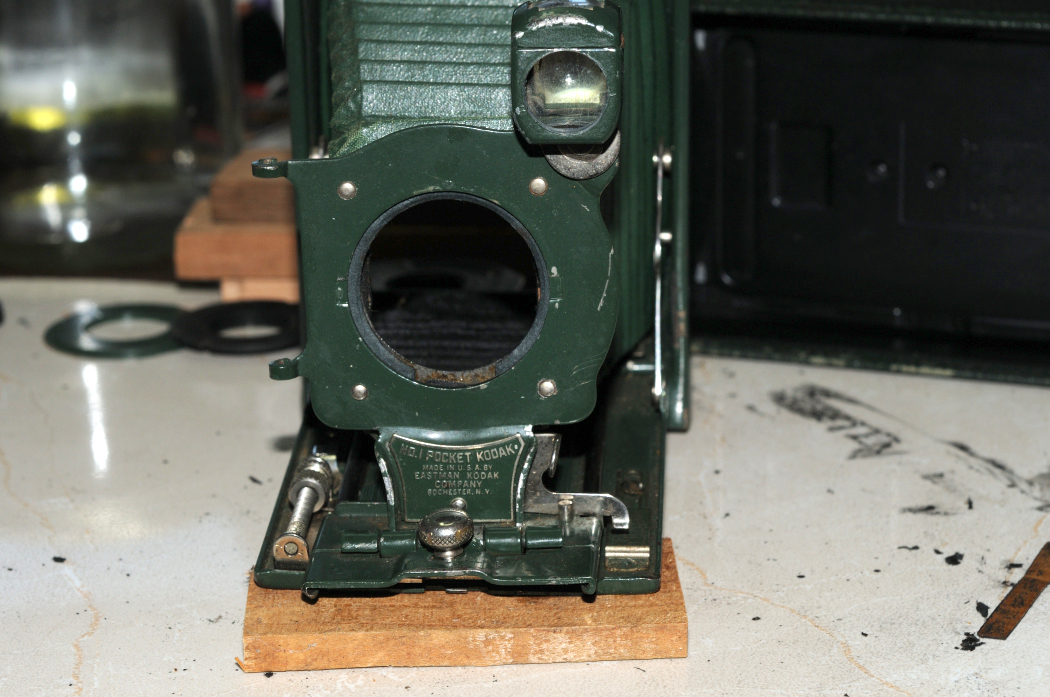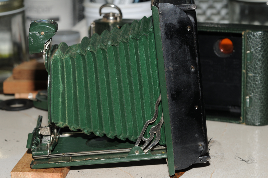 Another basket case in need of an economy repair. Front standard bent 20° rearward, bellows paper thin along the front half, missing the autographic pen as usual.