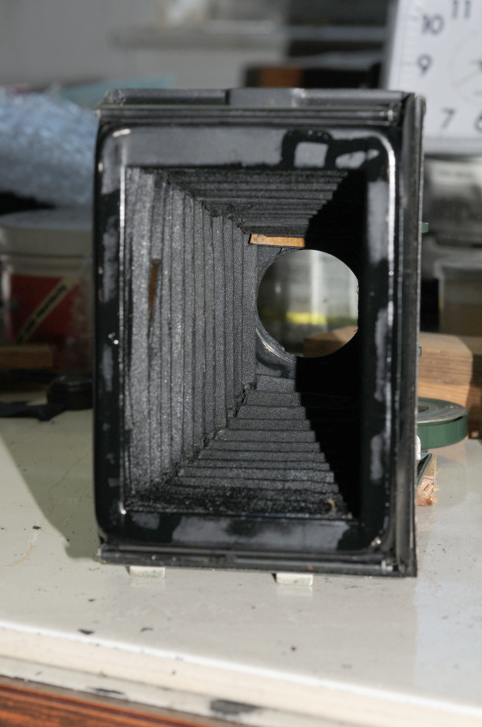 Fold over tabs at the film plane, riveted to the front standard hold the bellows in place. The inner layer of the bellows is the worst so I'll reline them without removing them.