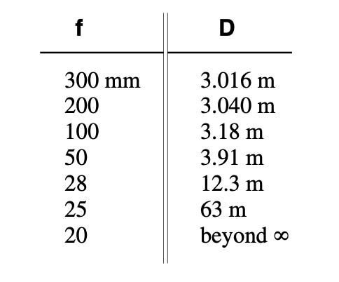 Well, let’s suppose we are photographing a person indoors. He is seated in a high backed rocker about 10 feet from our camera. About three feet behind him is a window. Through the window we can see part of the house next door and beyond that the mountains. We use a variety of lenses from 300 mm to 20 mm in focal length. Unknown to us a bit of film is stuck on the film pressure plate of the camera and so the film is actually .2 mm closer to the lens than it is supposed to be. What objects will be in focus? Using the basic lens formula, Equation (1), we obtain the answers shown in the table below. f is the focal length of our lens, Dis the distance from the lens to the object actually in focus. The subject’s eyes are at a distance about 3.000 meters (about 10 feet) from our lens.