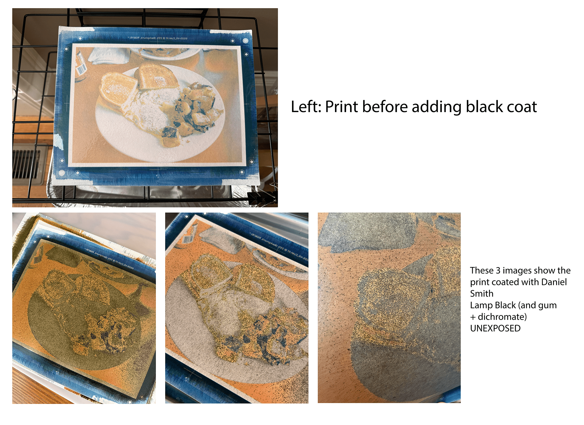 Once I coat with black (Daniel Smith Lamp Black) I'm noticing it gets extremely speckled. The coating you see is unexposed. I have relentlessly mixed the solution. First my stock pigment with dichromate, then with the additional gum.