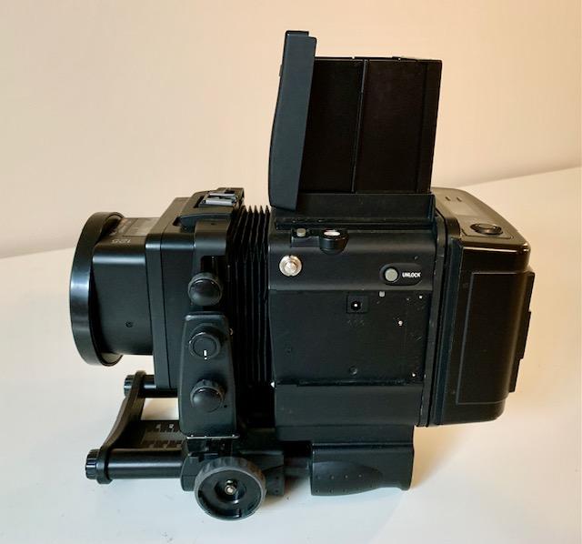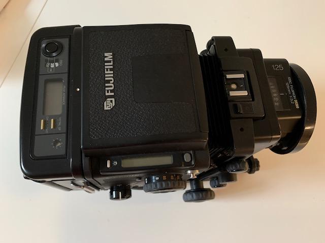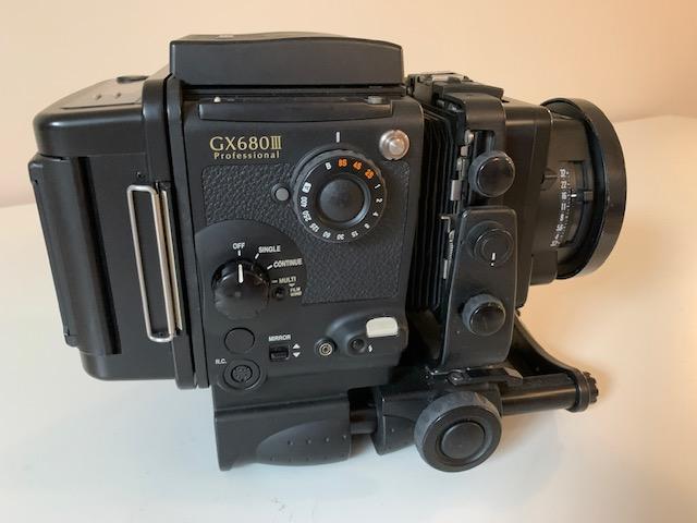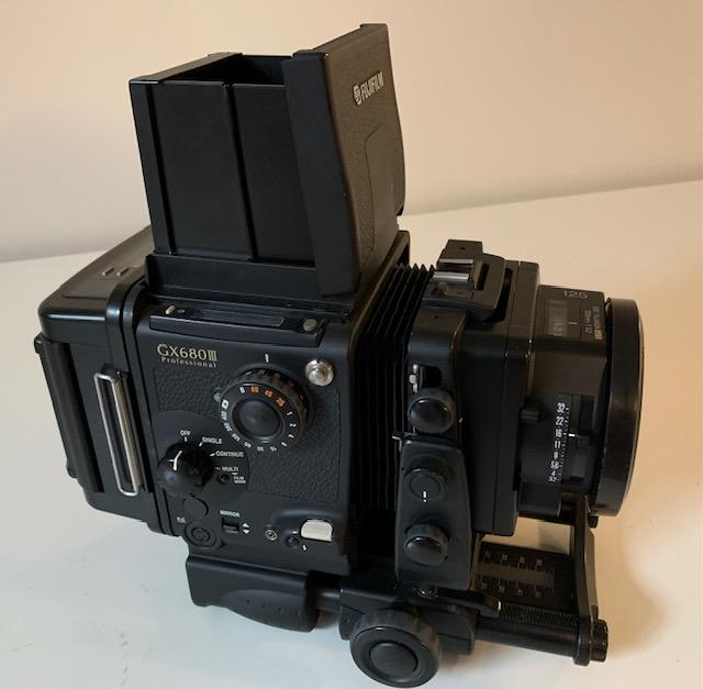Selling a Fuji GX680III with a 125mm F3.2 Fujinon lens and standard 120 Back. Camera works as it should and body is in good shape. This model has tilt rise and shift. Lens glass is in good shape with a few cleaning wisps and the usual dust specks. I ran a roll of film through camera and spacing was fine and shutter fires on all speeds from 8 seconds to 1/400. Focusing hood opens and closes smoothly and has pop up magnifier. Great cameras and the 125mm is a very sharp lens with a bright clear image in the finder.