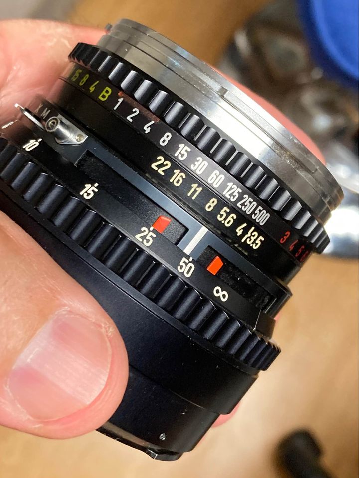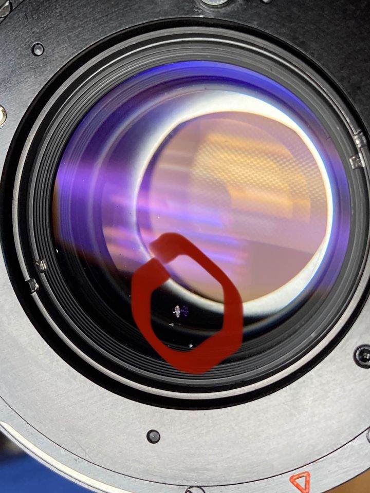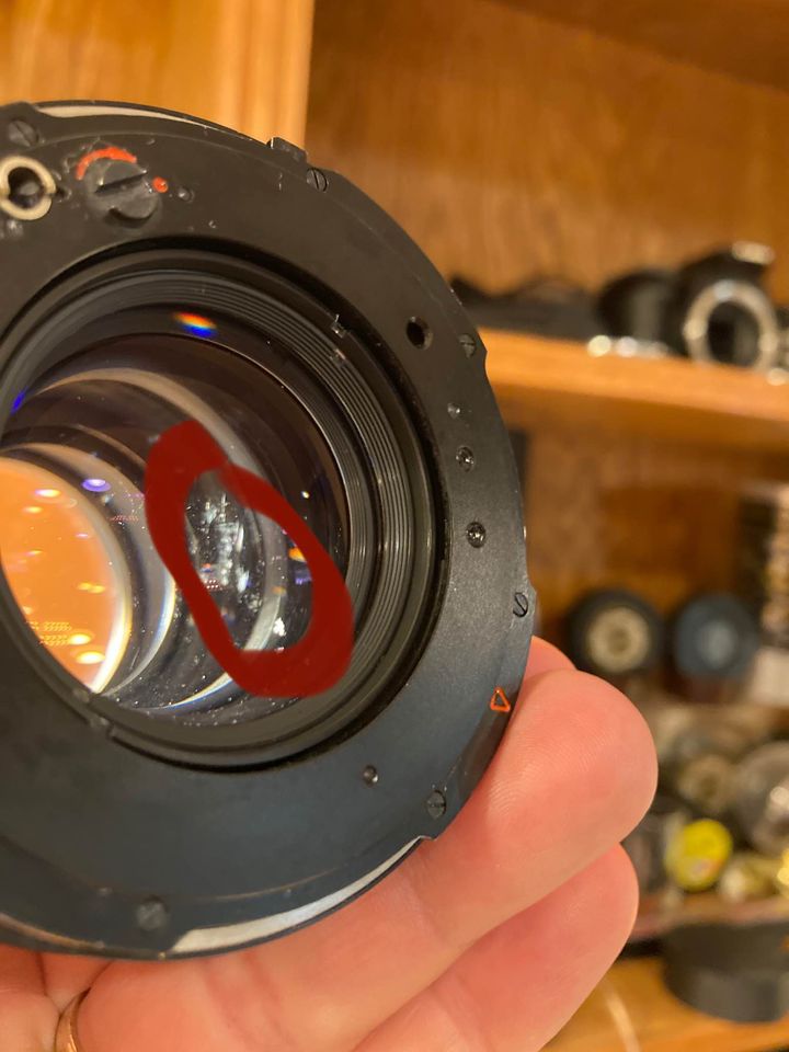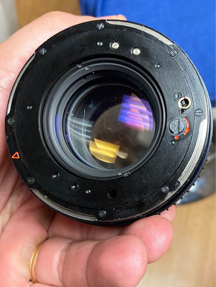 Lens looks barely used. Barrel is like new and the glass is very good with no haze, no fungus, some minor dust and unfortunately a tiny ding on the rear element and a scuff mark. Its not too bad but there - see images - the scuff only shows at a certain angle. I have tested the lens fully on my Phase One P25 digital back and I can see NO impact. In fact the images are excellent - with great color and sharpness even wide open. Take a look at test images (although facebook compresses the images too much) and some of the close ups. Shutter works well. Focus a bit stiff from lack of use, but works fine. If there were no ding in the glass, this would grade MINT- but with glass ding a beautiful 8-.