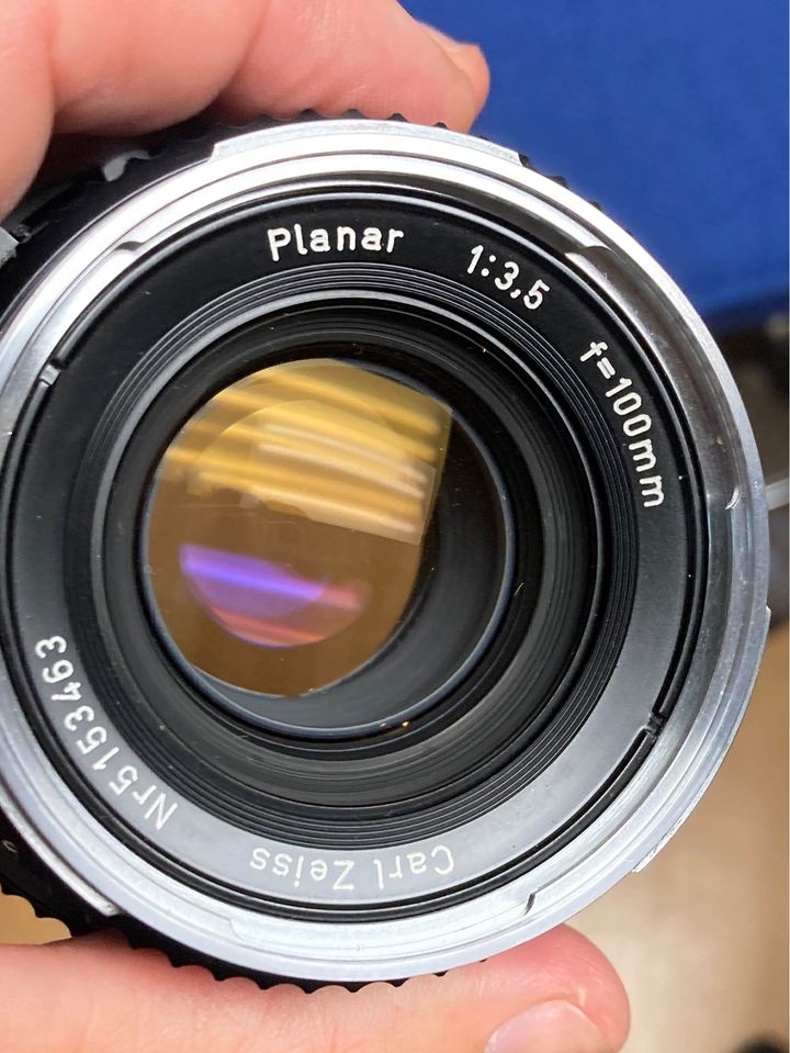 hasselblad Zeiss Planar f/3.5 100 mm C Lens made in 1970. Looks multi-coated. A classic lens that Zeiss designed especially for the Hasselblad line of SLRs for high resolution and corner to corner sharpness.