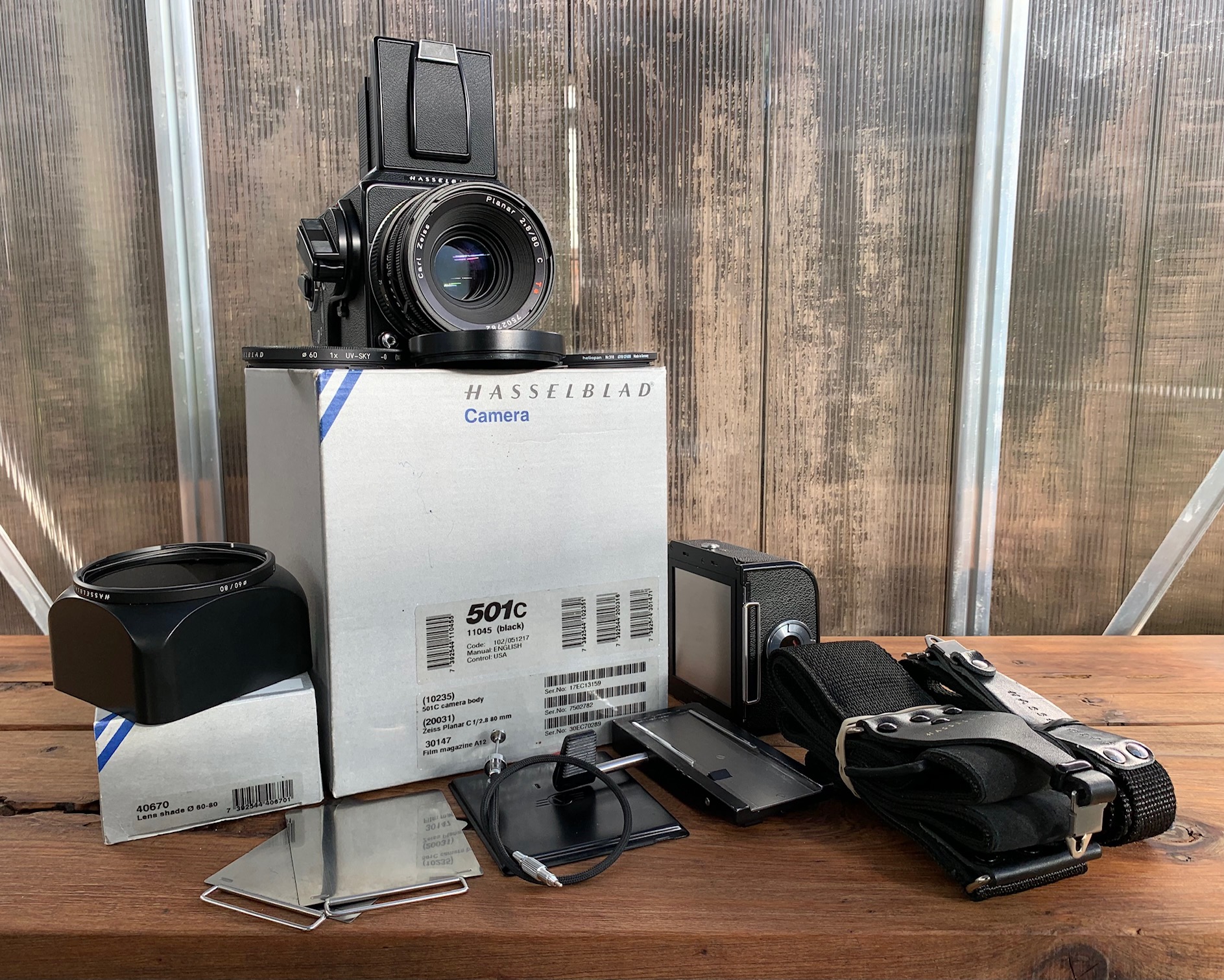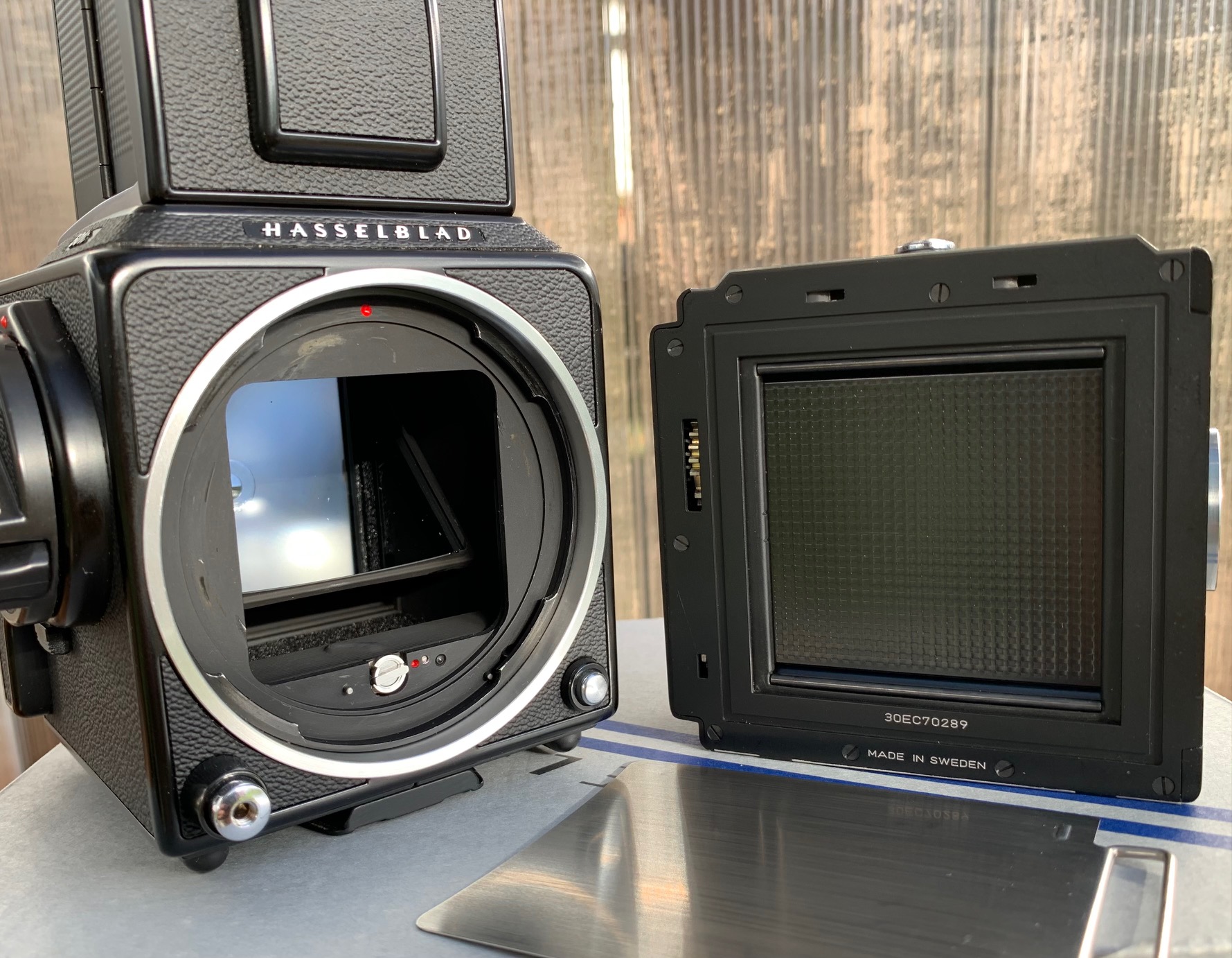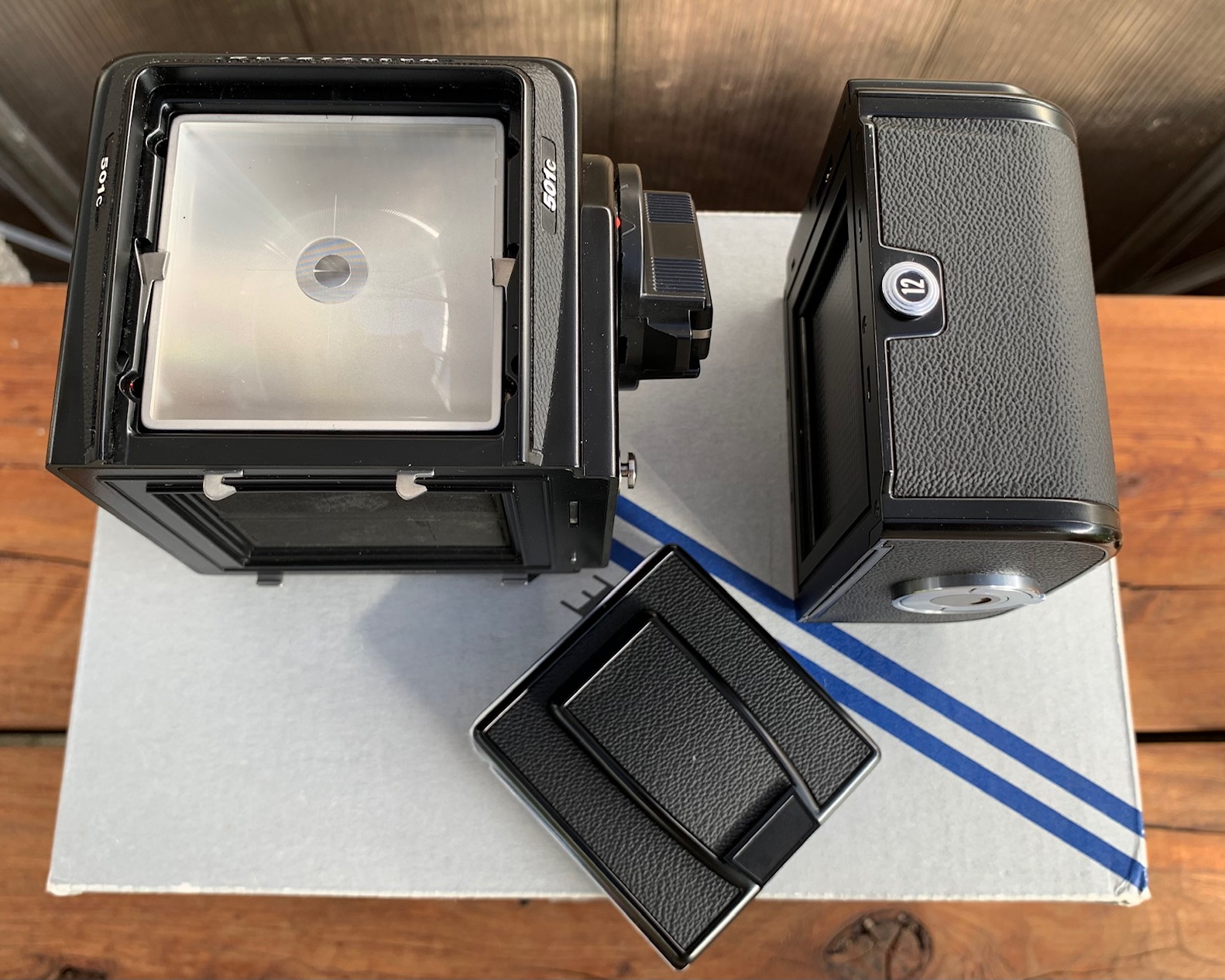 Moving out of Medium format to create funds for more large format endeavors. This all original 501C kit is in excellent cosmetic and functional condition. The camera has not been used very much and is very clean. All functions are smooth, snappy and accurate. It comes with an acute matte D focusing screen with micro prism and split level. It also has a separate digital back sensor mask that can be used with the focus screen as well. The lens is squeaky clean with one or two dust specs in it. I spent quite a while searching to find such a nice kit.