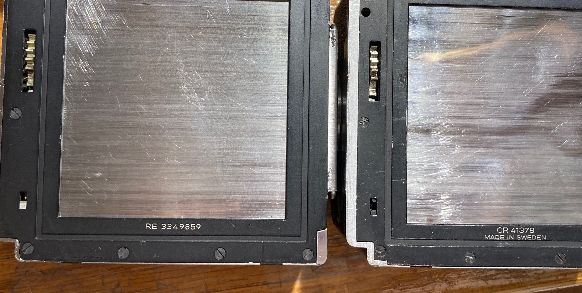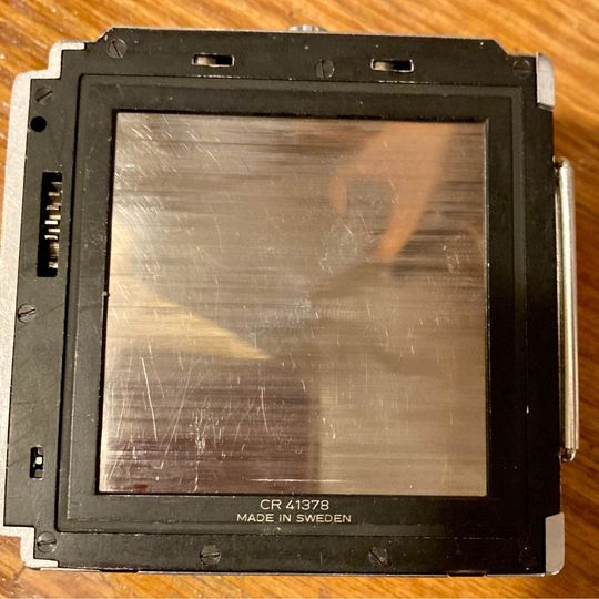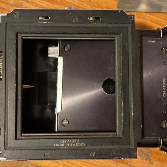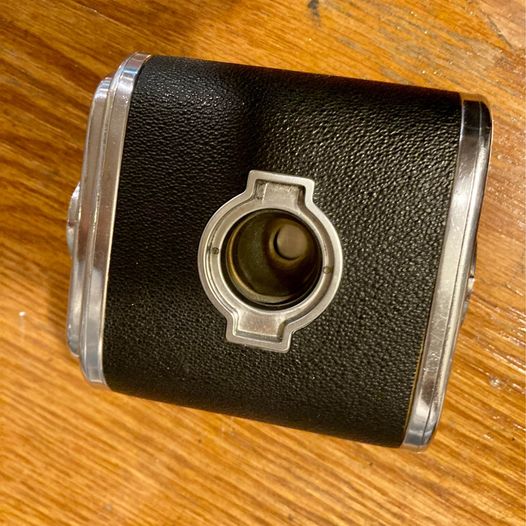 Hasselblad C12 Roll Film Back with matching insert in good overall shape BUT the door to the peep hole is gone. You can plug the hole or use black electrical tape and you have a working back, otherwise its for parts/repair $ 49 plus shipping.