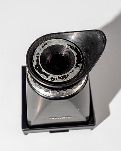Chimney finder for Hasselblad 500 series in good working condition. Cosmetically shows wear but works fine. Blocks extraneous light, making focusing easier, but it does not correct the "flopped" image like a prism finder does. Some people have mounted them on Rolleiflex TLRs (Irving Penn, for one) but I have not done this. It would require an adapter. $45.00 plus USPS shipping in USA.