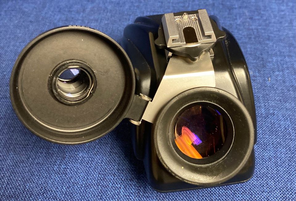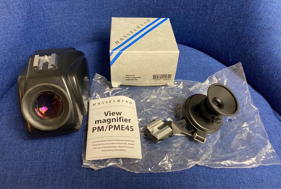 Hasselblad PM45 Prism Finder - late model "blue dot" version. Super high quality in used but great condition. Fits all 500 series cameras & 503 CW & 203 FE and 205 FCC/TCC. Glass is pristine. Provides a super bright and crisp focused image. Also included is the super rare and hard to find Hasselblad 42462 Prism Viewfinder Magnifier (for PM45 & PME45). In box with instructions - excellent barely used condition. Please note that the tiny front element of the magnifier is a bit loose, but not sure how to tighten it, but it has no effect - still works perfectly fine. $ 449 plus shipping. I ship worldwide to PayPal addresses