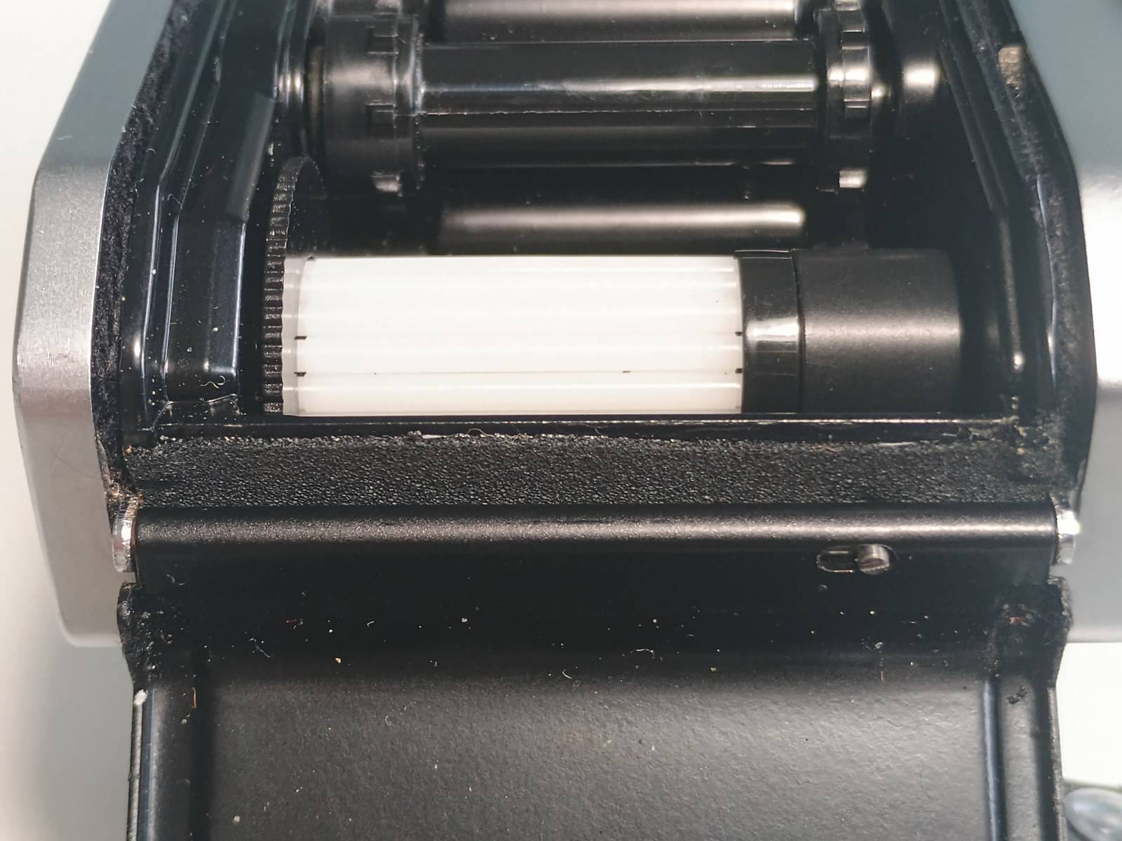 The gate is unrelated to this leak. It's light that seeps into the camera body along a seam in the back and exposes the film directly on the take-up spool. This happens some distance away from the film gate. The exposed-through sprockets are the giveaway that the leak is happening around the take-up spool.