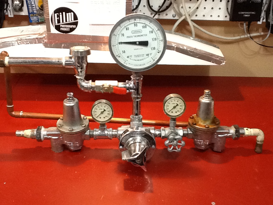 The outlet is off the "T" fitting under the large thermometer, the chrome plated fitting on the left of the outlet is a anti-syphon valve which prevents water from being drawn into the plumbing from a sink or washer if the incoming water pressure drops. That valve is a common plumbing code requirement.