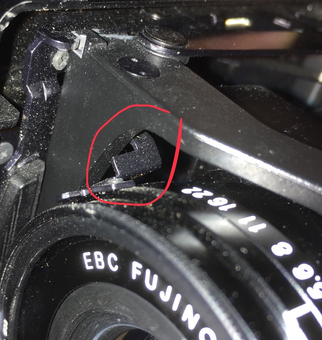 I was fiddling with the GF670 idly when I heard a light snap that sounded like something got detached (not that something broke, I think). Now the lens doesn't return to infinity. Tension stops it at 3m or so, and I don't want to force it.