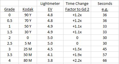 Mick, compared to your readings, there was no measurable difference between Grade 2 and 2 1/2 but the jump to grade 3 indicates 50% more time. Easter long weekend coming up means I might just test this and see how accurate it is. I got these Kodak settings from a very old card that's been pinned to my darkroom wall for 25 years so would also be interested if you have any major differences from your sources. Cheers