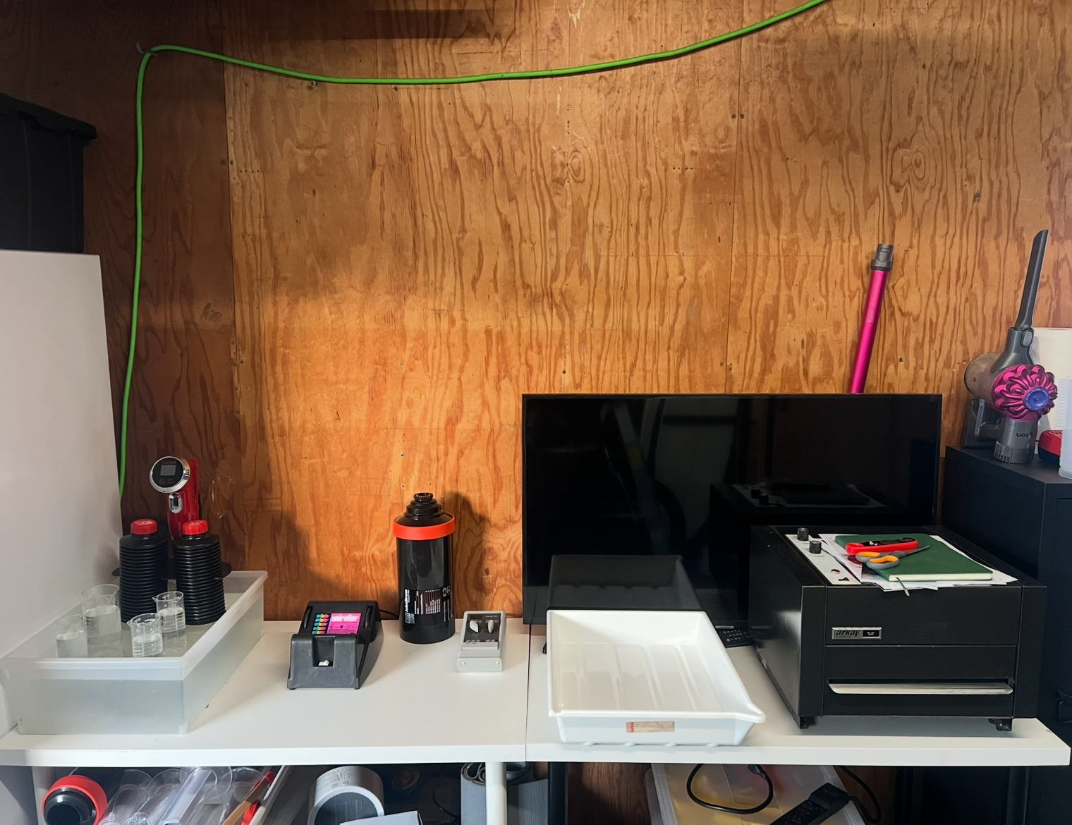 This is the work in progress darkroom. The wet/processing station is temporary right now. I would like to see if I could potentially fit that in that little nook area where the husky cabinet and c stands are currently stored. It might be possible but it’ll be tight. I need to fit a laundry sink and then table space for the water bath, the drum roller and a print washing tray. The Arkay print dryer I plan on building or buying a little rolling cart that can hold the dryer which I can then store somewhere and wheel it out for printing sessions. This may not be the right section of the forums but I did want to pick people brains on this layout and any ideas they had for making the space work when it comes time to finish phase 2 of my darkroom.