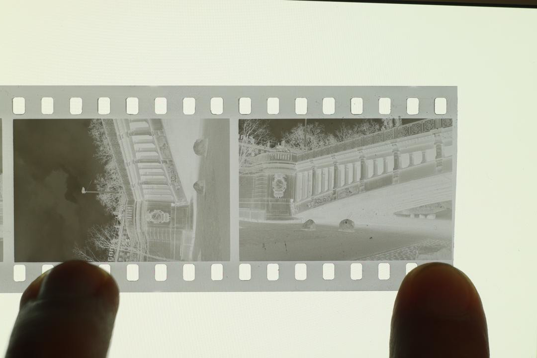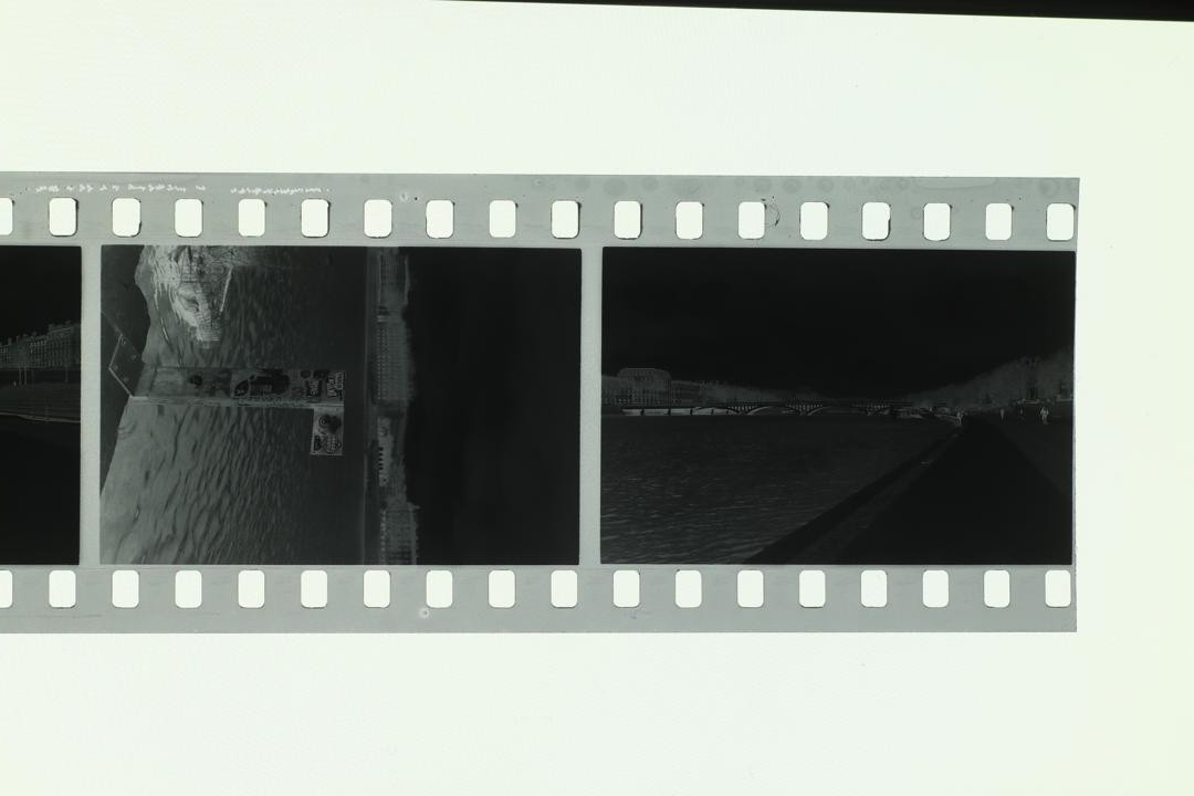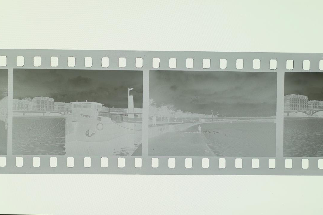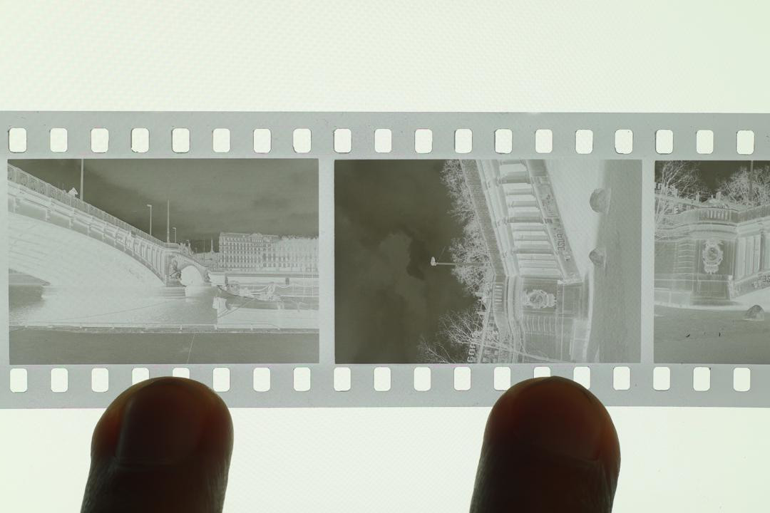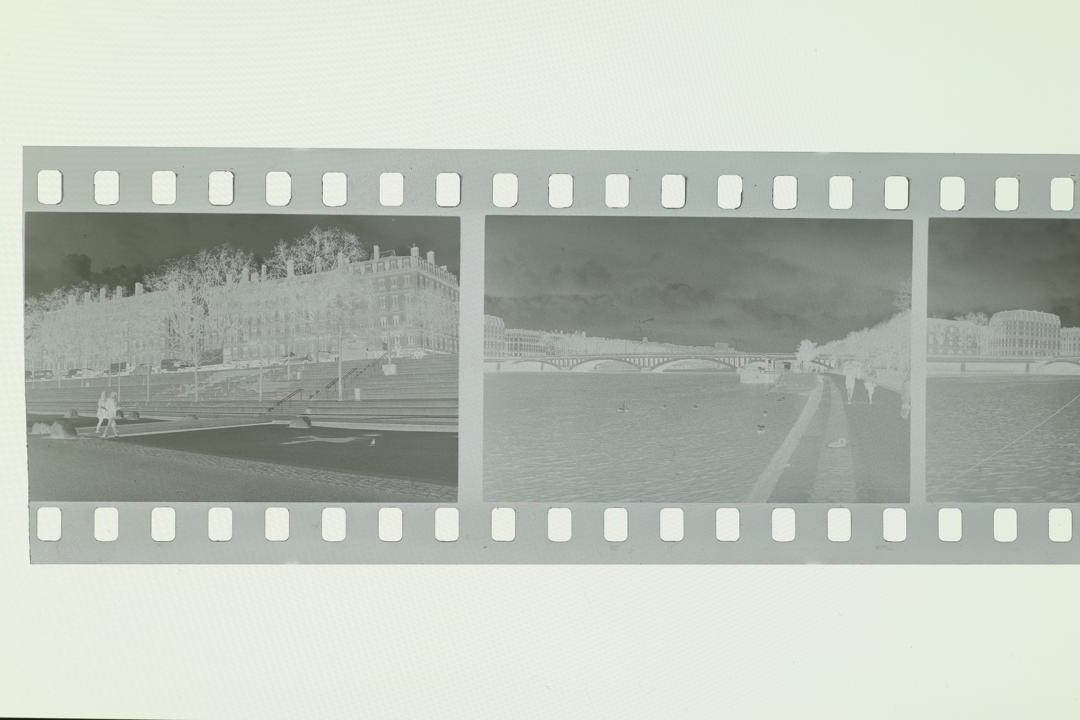 • Pictures of the negative : APS-C Canon EOS M100 mirroless camera, 50mm M42 fujinon f/1.8, no filter. Without and with extension tube for the close up shot. ISO 100, f/11, aperture priority mode. Light source was a phone. No edit on the first picture except rotation. The positive was done with the following method : 1) jpeg opened in GIMP 2) rotation/crop 3) colors->invert 4) colors->levels->auto 5) mode->grayscale 6) export.