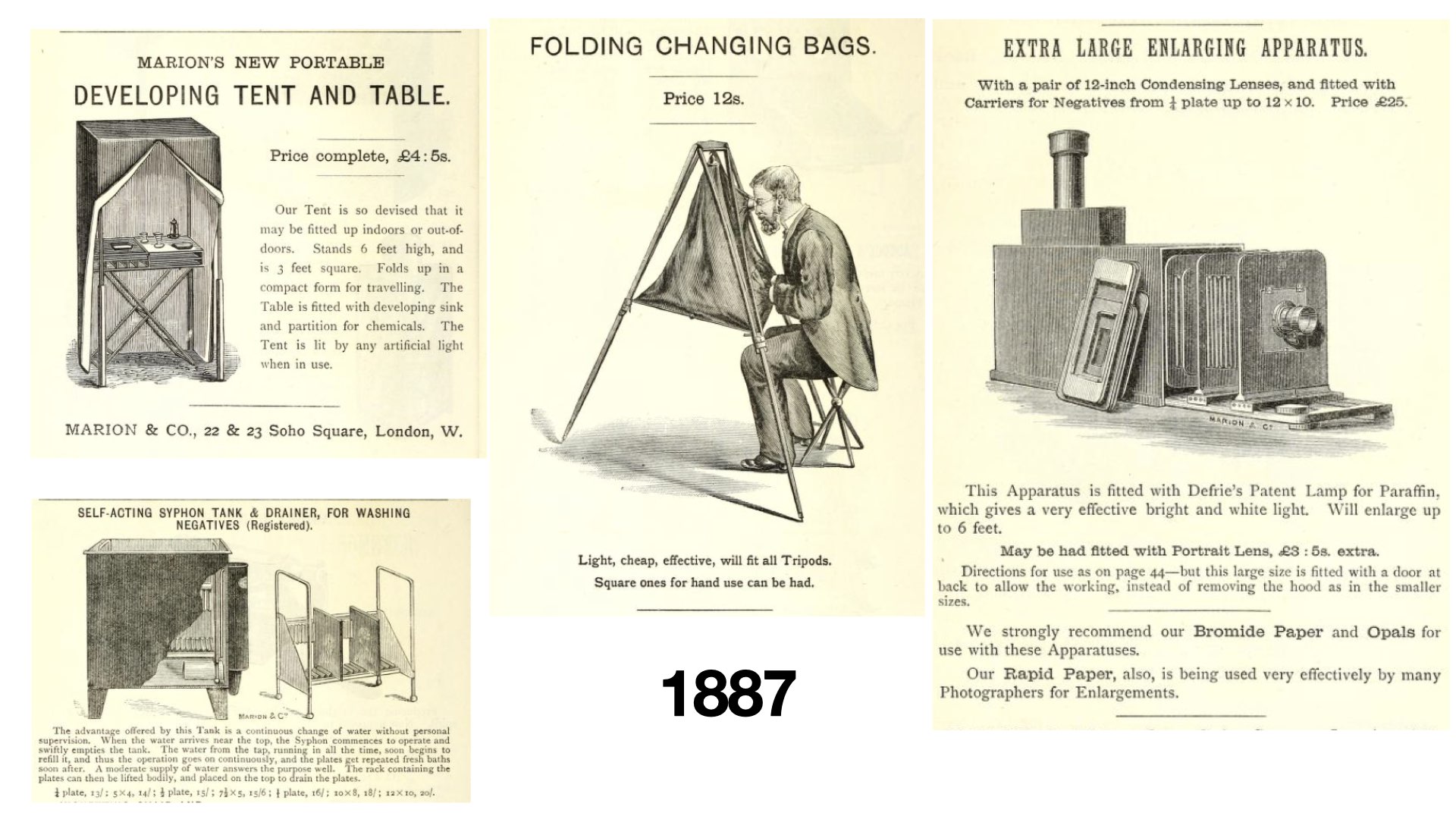 ... I'm not so much interested in recreating the tools and chemicals used at that time, but more interested in the actual physical darkroom objects - trays, bottles, lamps, etc. It could include chemicals as well, as I'm sure the darkroom user of the past worked more with individual chems for mixing, rather than the pre-made developers, stop, fix, toners, etc. that many (most?) darkroom users use now. As you have mentioned, many of the items that were in common use at one time may be completely gone and if found, be unrecognizable to a current darkroom user. This has been my experience as I've come across old darkroom equipment for sale and had no idea what it was, or if I did, how I could use it. As a historian, it's the use of the objects that interest me. I know the old books you mentioned would be an invaluable resource, and if I had the chance to go to Australia I would be happy to make a special trip to see your collection, but at the same time I'm interested in photos of not only the sterile, perfectly positioned photos for ads, but ideally of the nitty gritty mess and chaos of real darkrooms, although who knows if people actually photographed their darkrooms way back when.