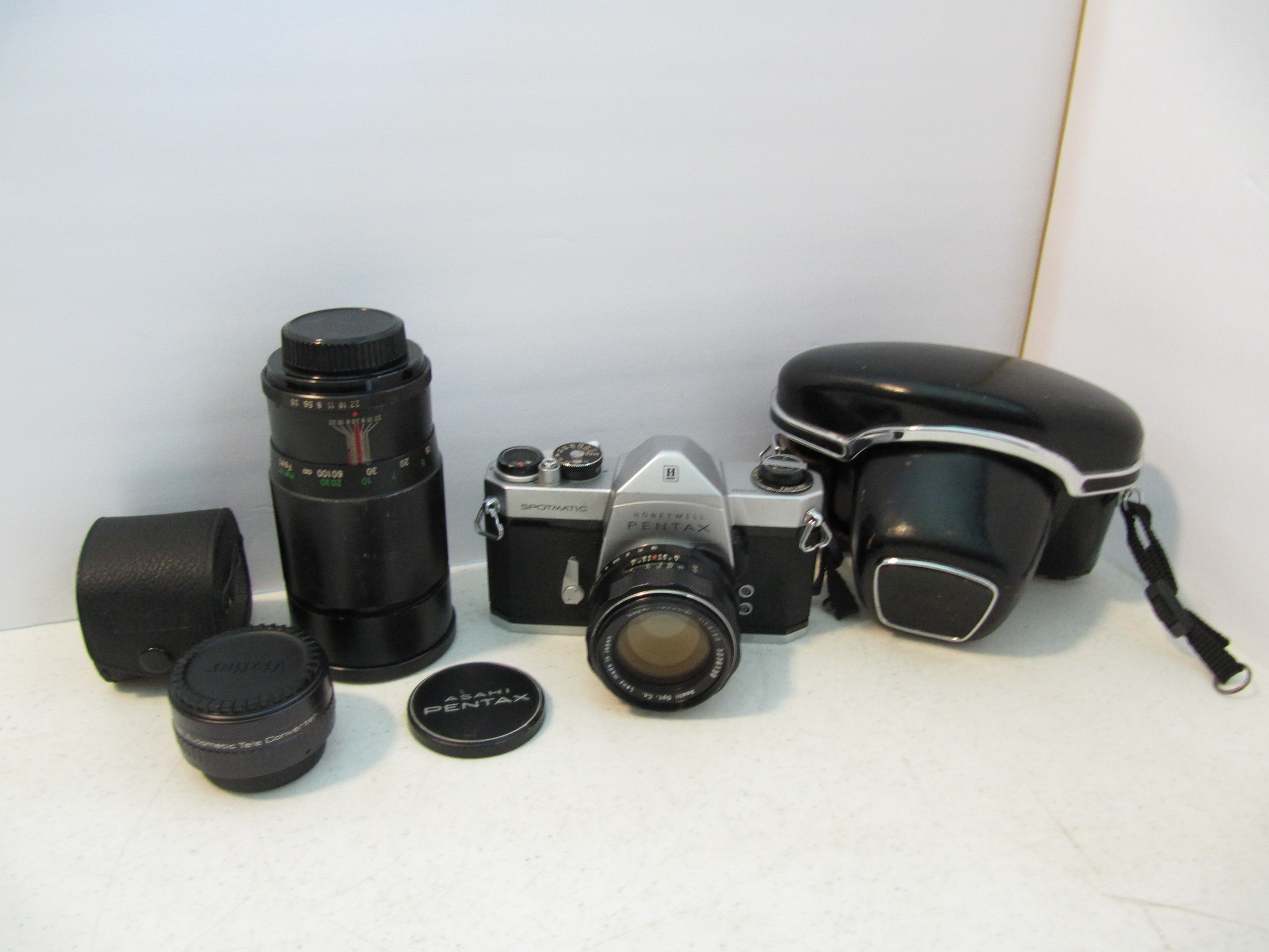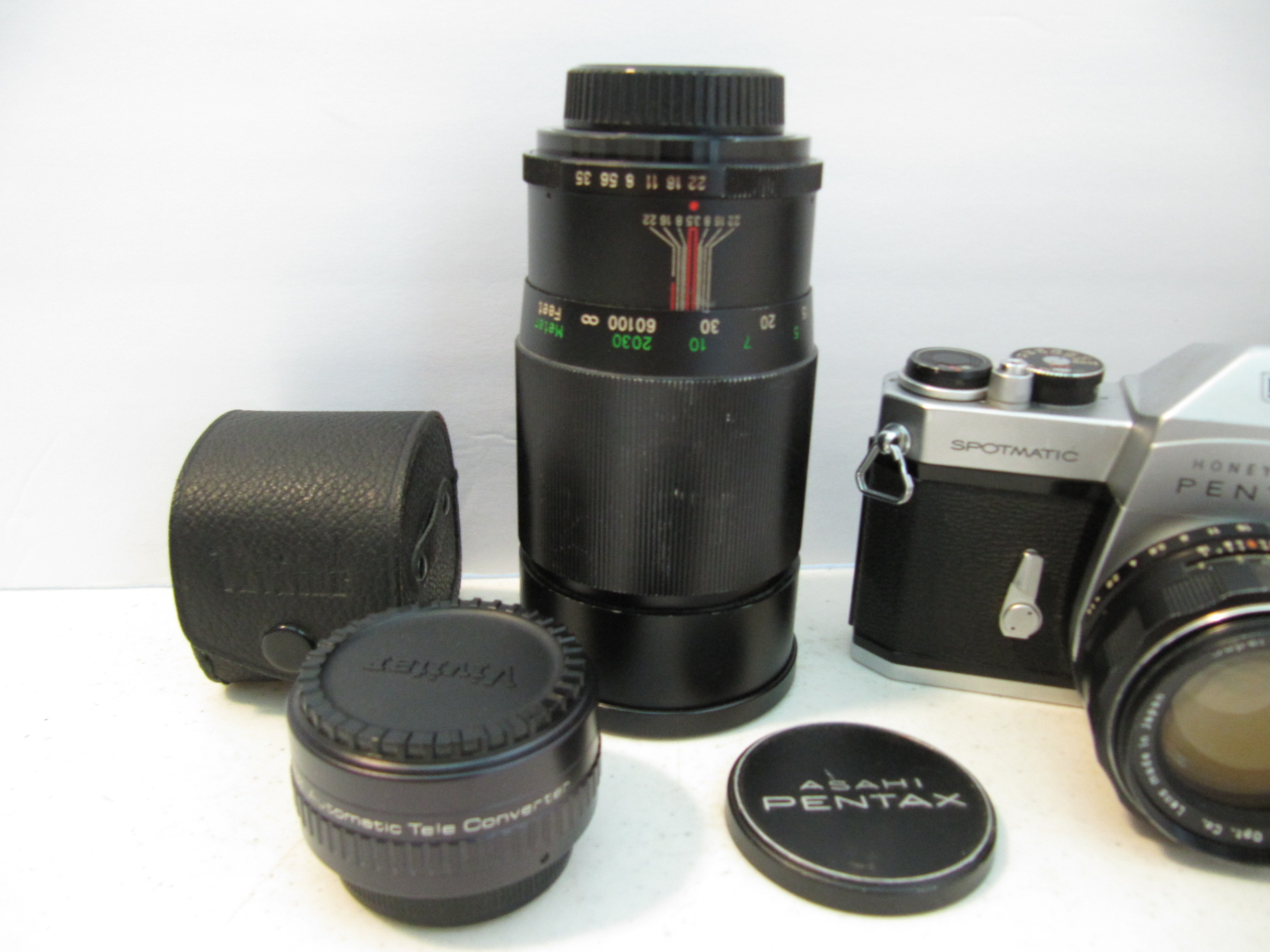 DESCRIPTION: Honeywell Pentax Spotmatic Bundle. Includes: Spotmatic body with leather case, Super Takumar 50/1.4 lens & front cap, Vivitar 200/3.5 lens & caps, Vivitar Automatic Tele Converter 2x-1.