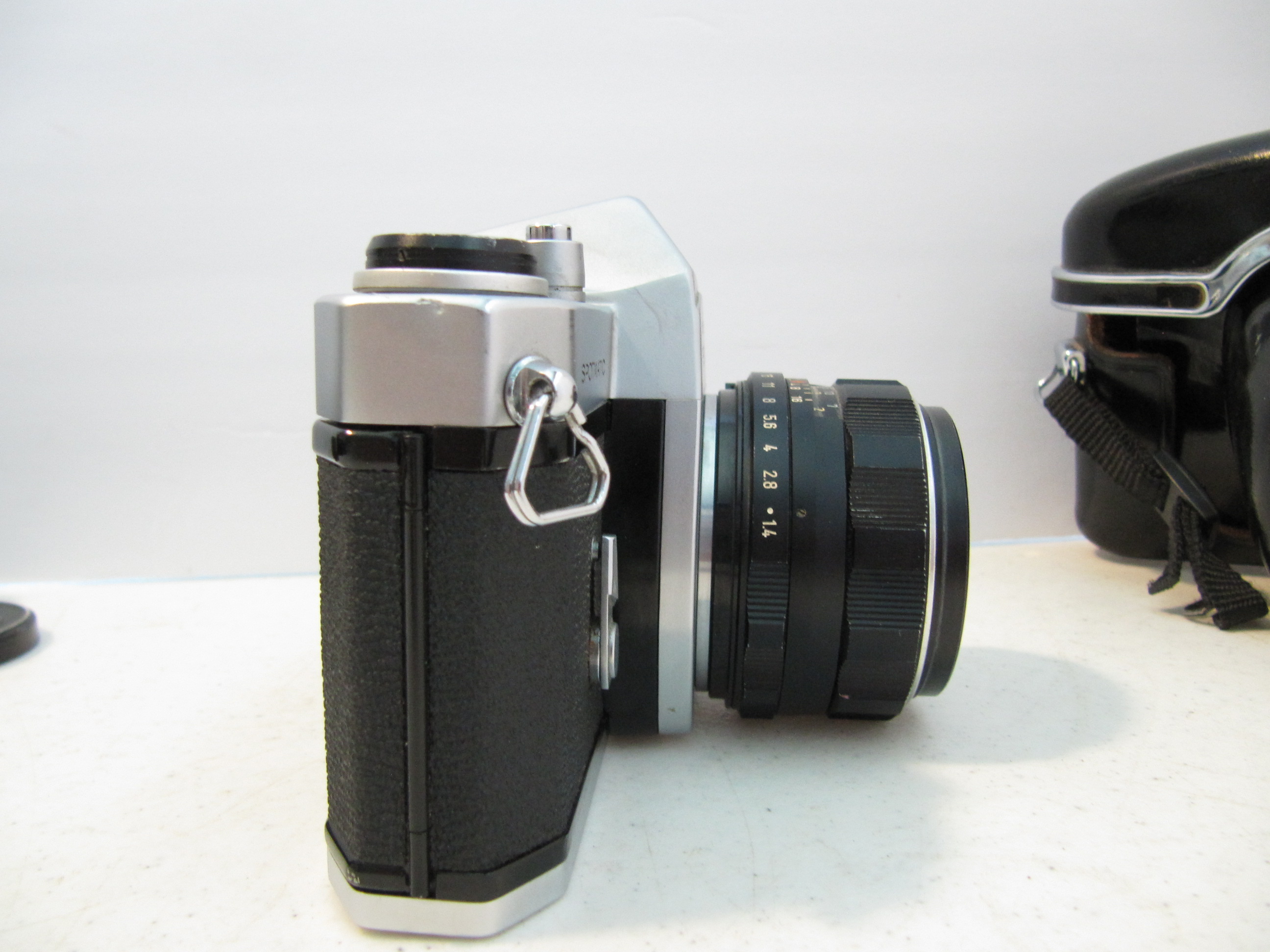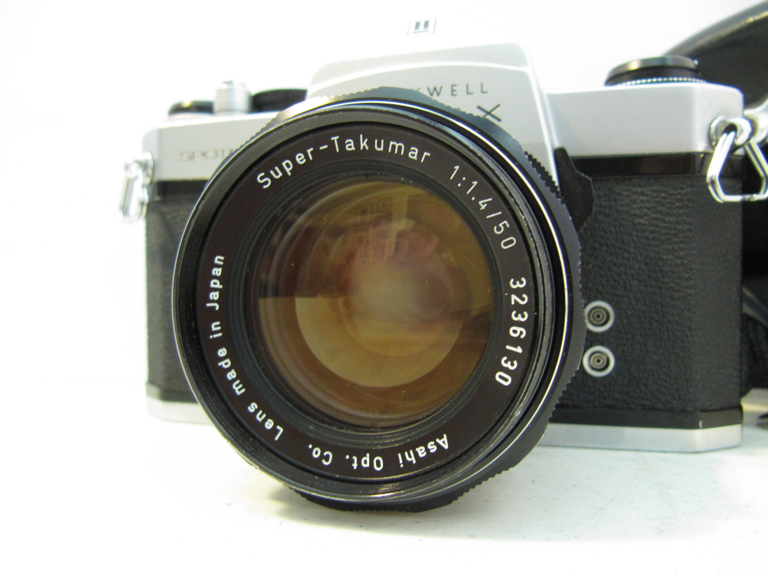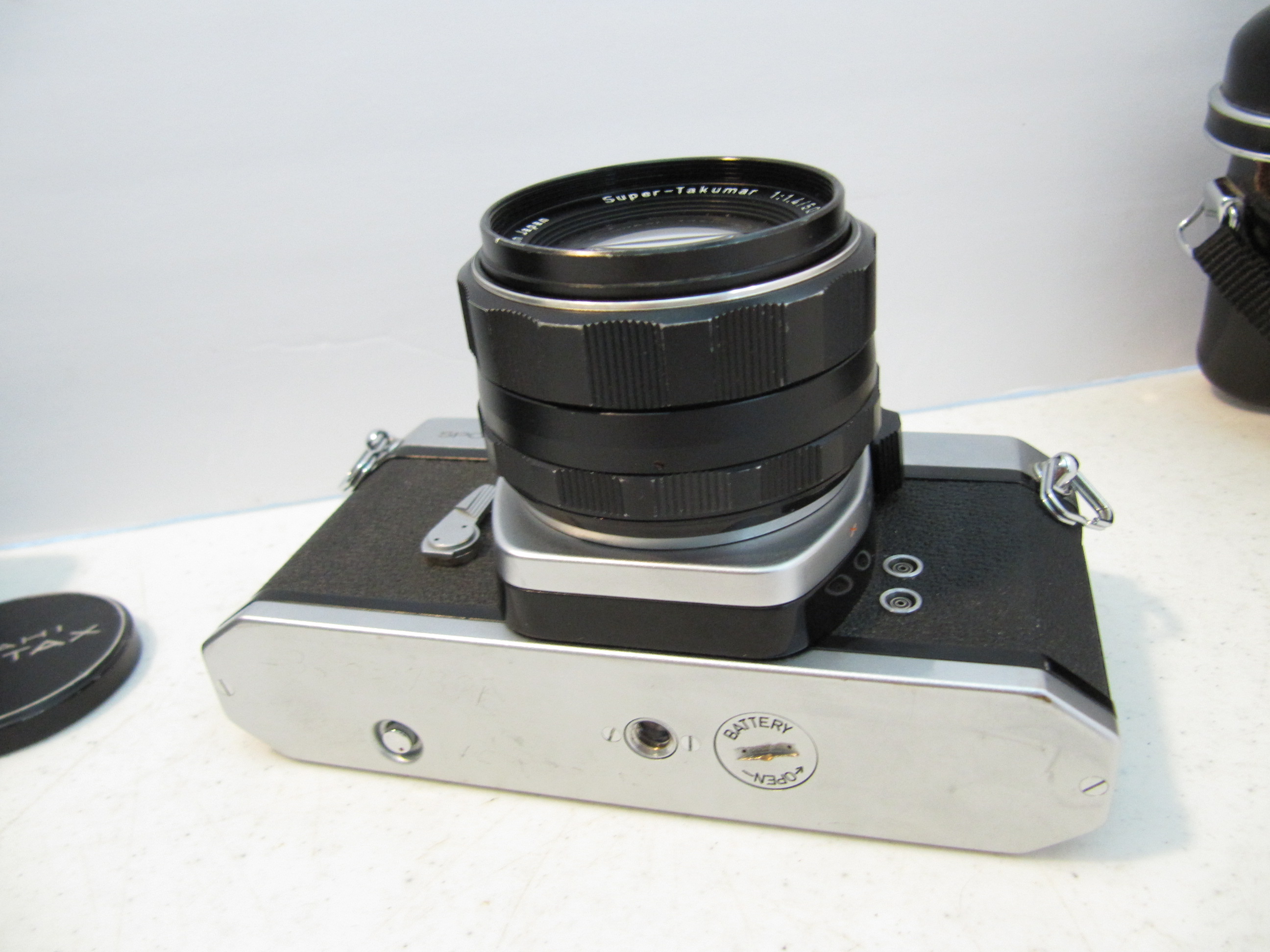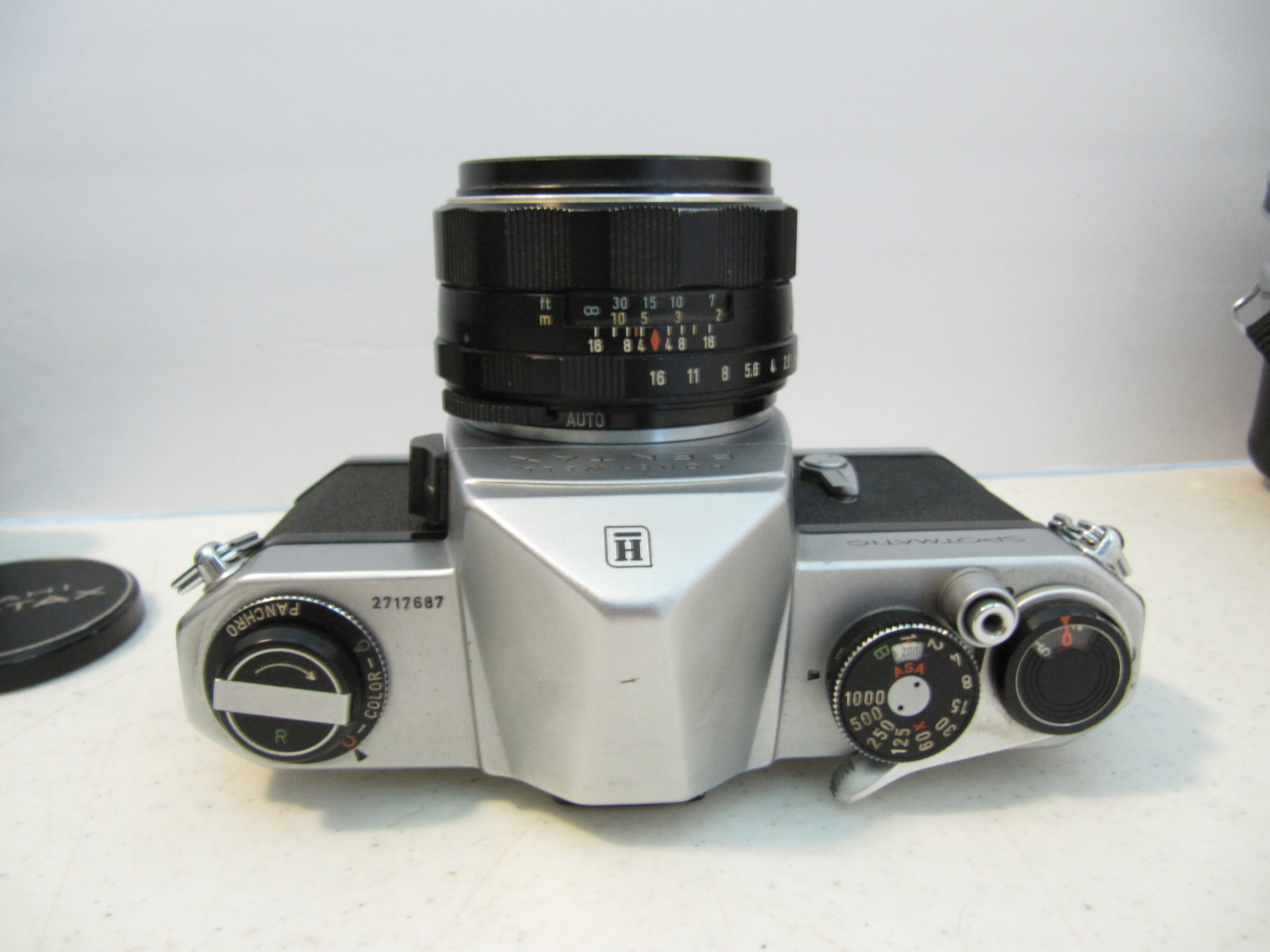 If I didn't already have a Spottie of that same model, and two other working M42 SLRs, I'd be all over this. The 50/1.4 Super Takumar is legendary, one of the best normal lenses ever (and if there's too much tea color in the thoriated element, you can clear it up by wrapping foil over the rear end and leaving it foil side down on a windowsill in direct sun for a few weeks -- I've done it).