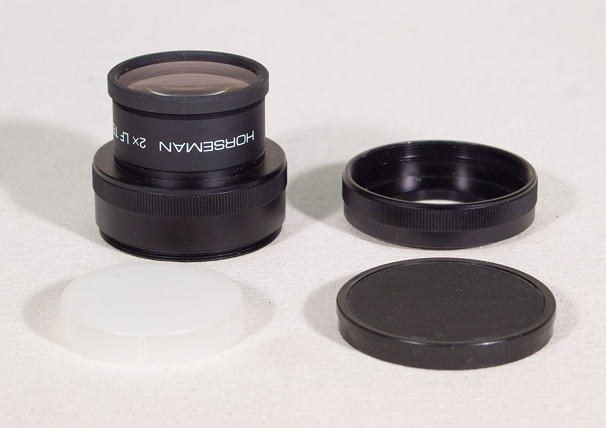This is a Horseman 2X LF Tele-Convertor that's in excellent condition. Glass has no scratches that I can see. (Certainly nothing obvious.) When installed, it doubles the focal length. I believe that, in particular, it was designed to convert a 150mm lens into a 300mm lens. The build quality of this tele-convertor is excellent.