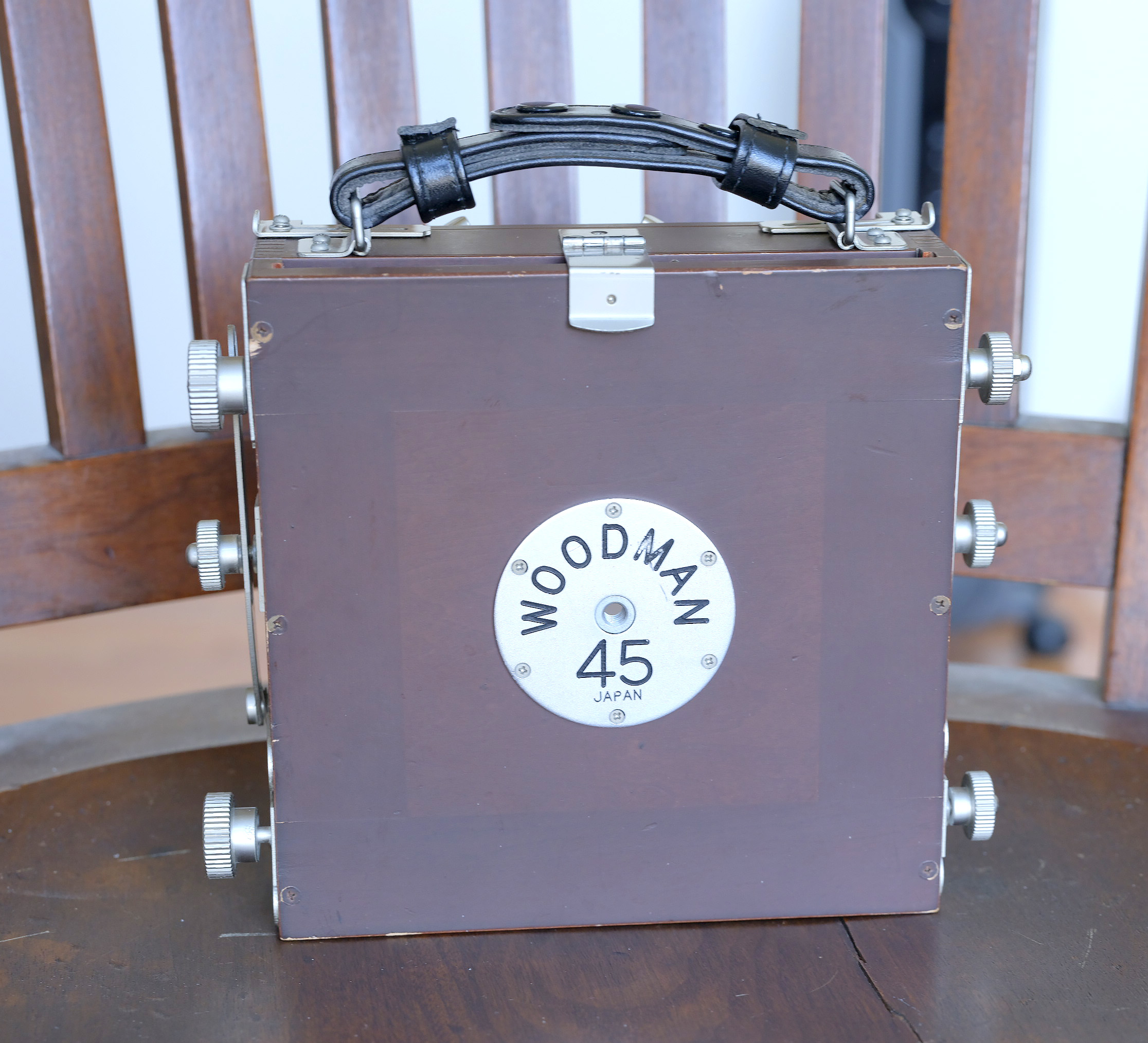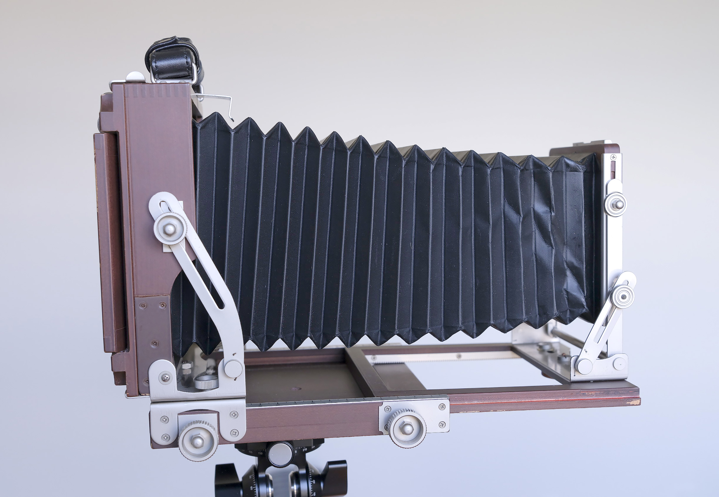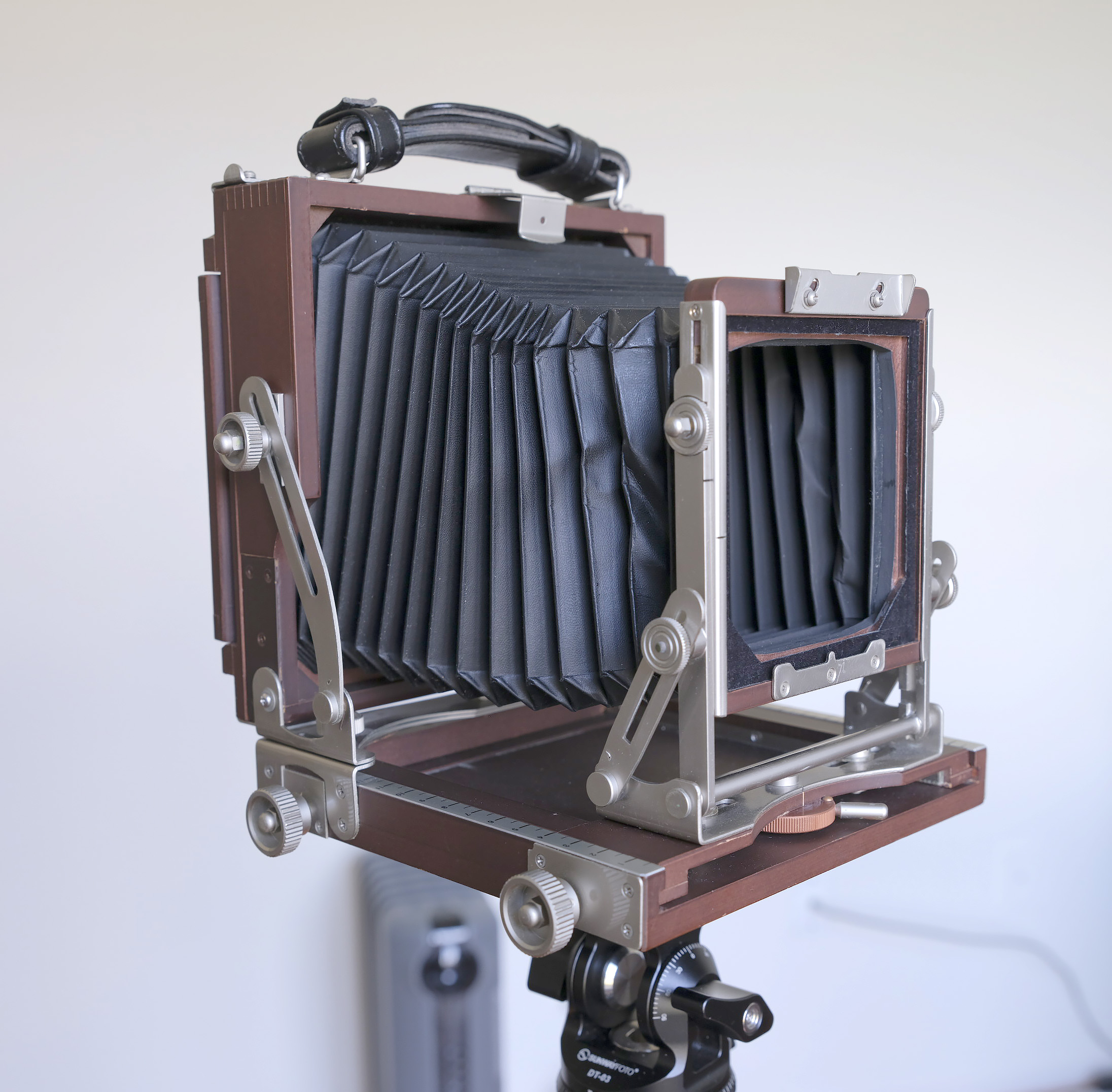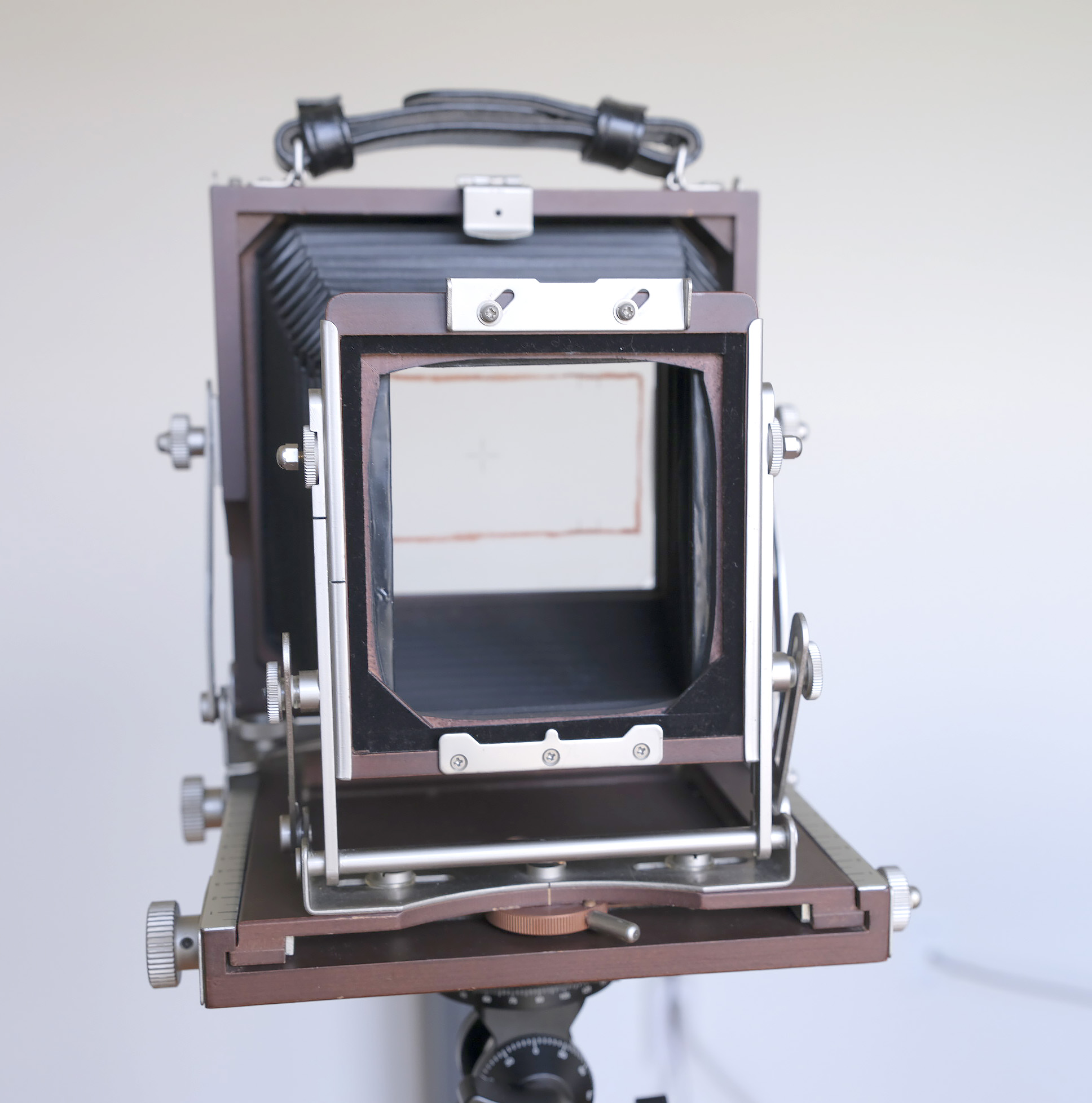 For sale is a Horseman Woodman 45 lightweight (and compact) field camera. The camera is in good to excellent condition, with a few scrapes of the finish on the back as shown. This cherry wood camera is very lightweight at 3.2 pounds, has a bellows extension of 225mm, a track extension of minimum of 45mm and a maximum extension of 315mm, folded dimensions of 200 x 205 x 85mm, front swing, forward and backward tilt, 30mm rise and fall, and an international Graflok back. Price is $450.00 USD which includes shipping within the US. I will wipe off the grease marker on the outside of the ground glass which I used to frame 6x12 shots.