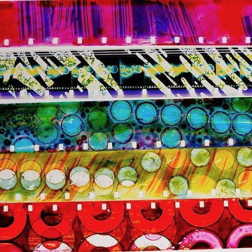 The description of the picture was "In this 2 day workshop students learned to manipulate the surface of 16mm film using a variety of direct film-making techniques; painting, scratching, collage, and masking in order to create an experimental animation." if that helps at all.