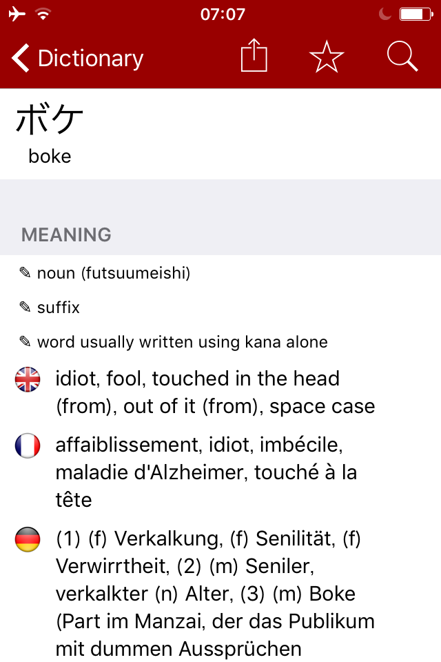 That dictionary is plain wrong. Boke is the english spelling of the Japanese word (some yank turned that into Bokeh in some delusional attempt to claim it for themselves). In japanese it means blurred of fuzzy (more or less). But it is also sometimes used in japanese as a derogatary word for old people by saying that someone is a bit boke. i.e. they have gone a bit fuzzy in the head.