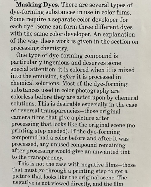 But slide film obviously doesn't use masking. How does it work then? I rarely shoot slides because I do not have a projector (although I like them projected) but I always felt they look somewhat cartoonish after scanning. Is the absence of a mask the reason for why transparencies usually look so unnatural and have such a narrow latitude?